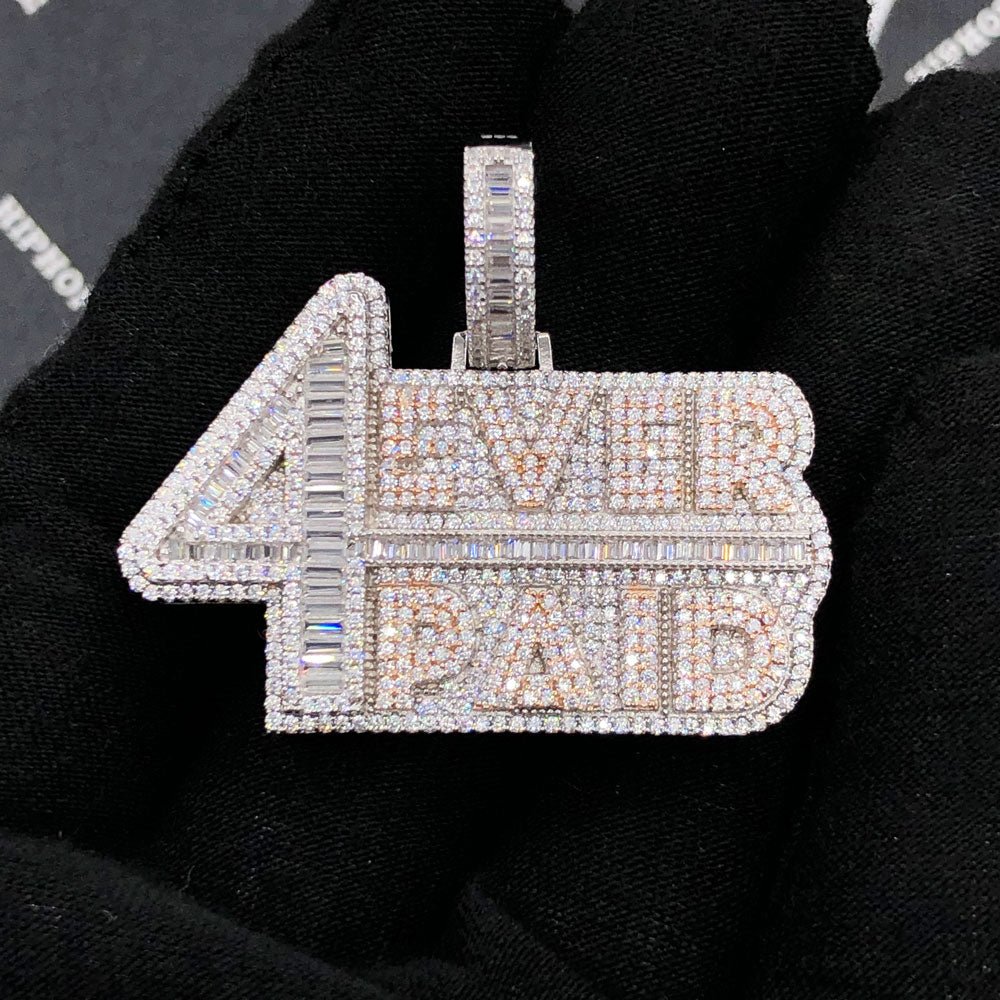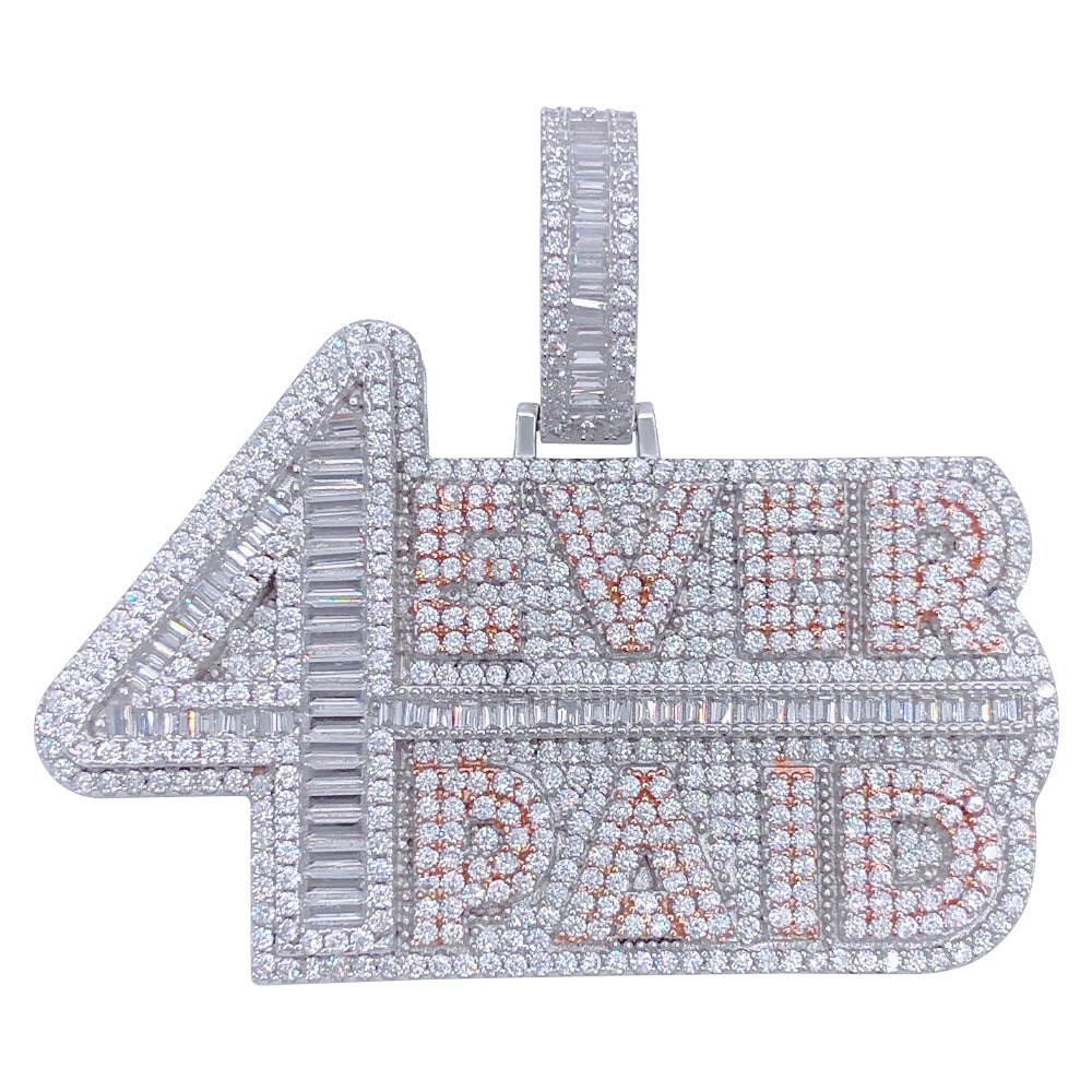 .925 Silver 4 Ever Paid VVS CZ Iced Out Pendant. Crafted from real Solid .925 Sterling Silver with an incredible bling bling shine. Limited Edition Iced Out Hip Hop Pendant. Stones are VVS Simulated Diamonds Prong Set, the same way genuine diamond hip hop jewelry is made. Get the same look, feel and shine for less on real Silver. Stand out from the crowd with this this detailed quality made iced out pendant.