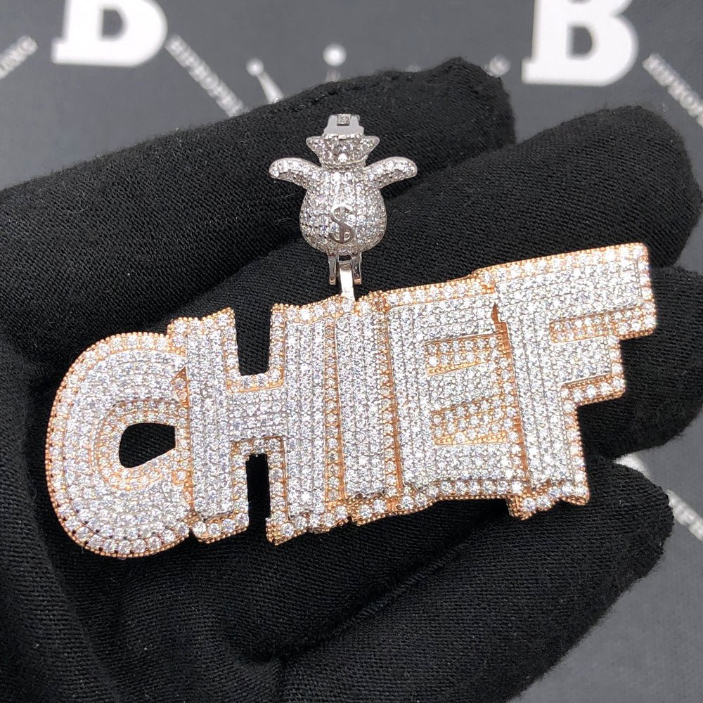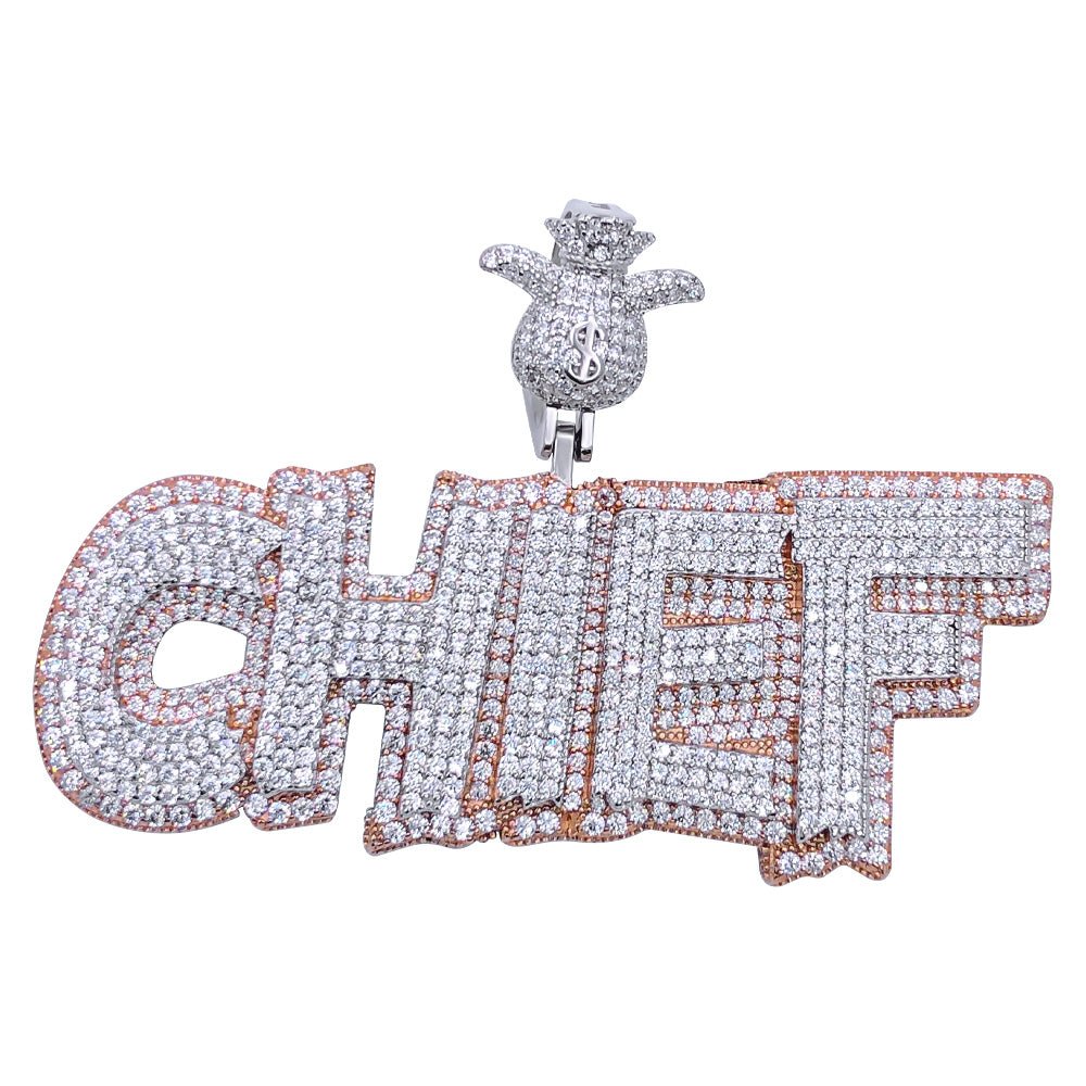 .925 Sterling Silver CHIEF VVS CZ Iced Out Pendant. Crafted from real Solid .925 Sterling Silver with an incredible bling bling shine. Limited Edition Iced Out Hip Hop Pendant. Stones are VVS Simulated Diamonds Prong Set, the same way genuine diamond hip hop jewelry is made. Get the same look, feel and shine for less on real Silver. Stand out from the crowd with this this detailed quality made iced out pendant.