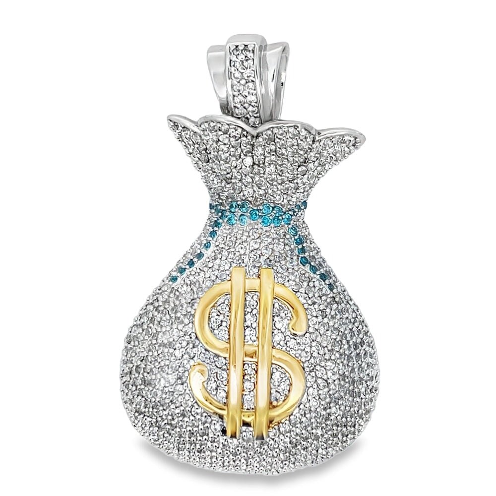 Money Bag CZ Pendant .925 Sterling Silver. Quality crafted hip hop bling pendant. Crafted from fine .925 Sterling Silver and wrapped to look and feel like solid Gold at a fraction of the cost. Prong set CZ Cubic Zirconia stones, set with precision gives this iced out pendant a beautiful and bright bling bling shine. A must have in your hip hop jewelry collection.