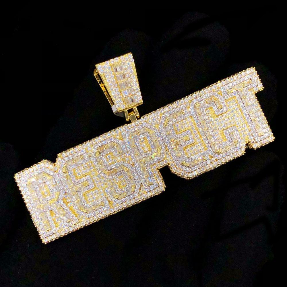 RESPECT Baguette Plaque VVS CZ Hip Hop Iced Out Pendant. Limited Edition Iced Out Hip Hop Pendant. Stones are VVS Simulated Diamonds Prong Set, the same way genuine diamond hip hop jewelry is made. Stand out from the crowd with this this detailed quality made iced out pendant.