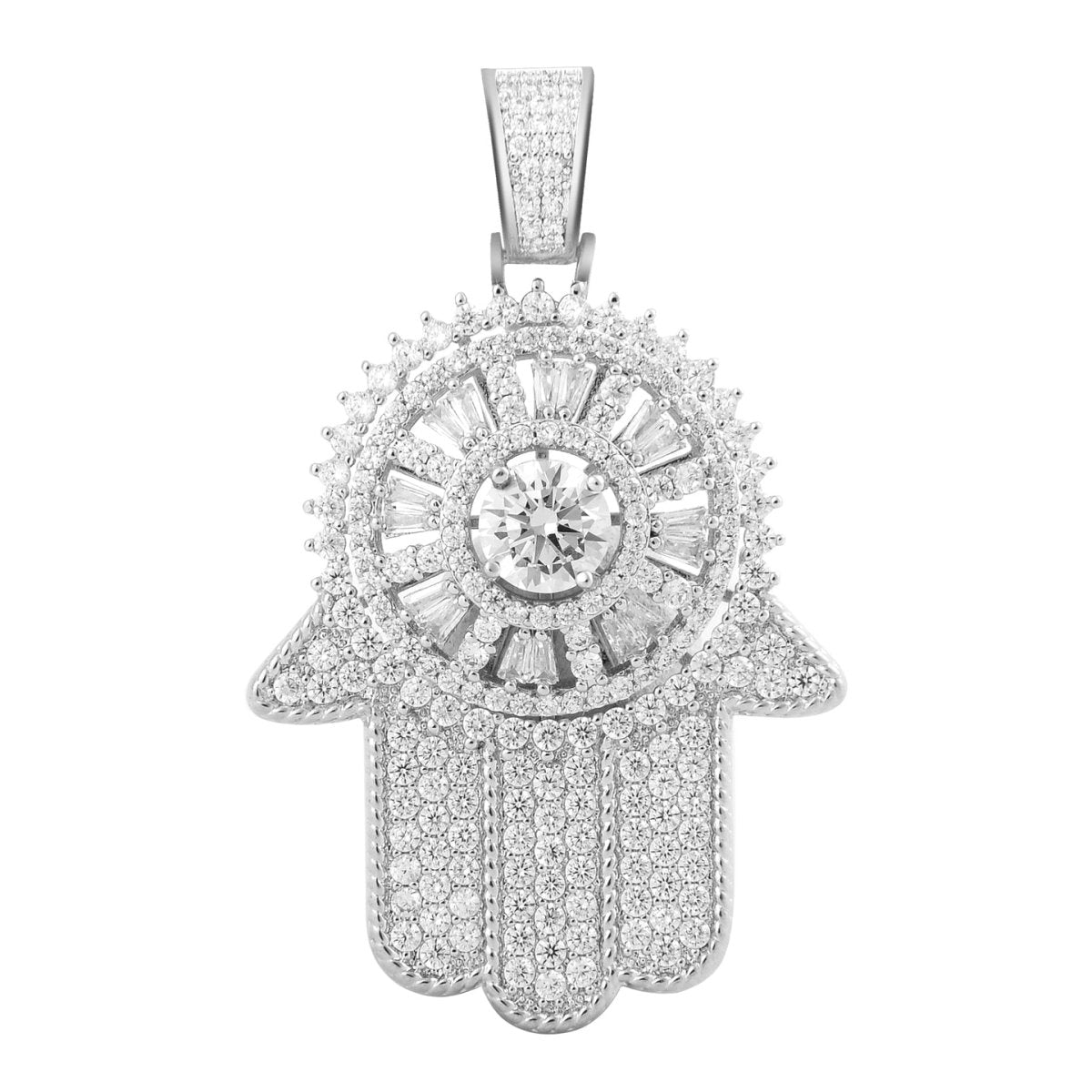 .925 Silver Spinning Hamsa Baguette CZ Iced Out Pendant. Center part spins! Crafted from real Solid .925 Sterling Silver with an incredible bling bling shine. Limited Edition Iced Out Hip Hop Pendant. Stones are VVS Simulated Diamonds Prong Set, the same way genuine diamond hip hop jewelry is made. Get the same look, feel and shine for less on real Silver. Stand out from the crowd with this this detailed quality made iced out pendant.