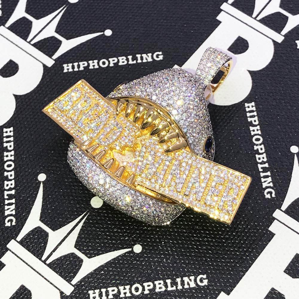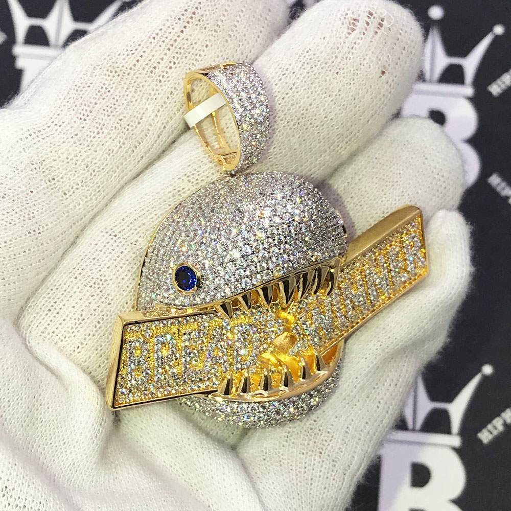 Bread Winner Shark CZ Hip Hop Bling Bling Pendant. Limited Edition Iced Out Hip Hop Pendant. Stones are VVS Simulated Diamonds Prong Set, the same way genuine diamond hip hop jewelry is made. Stand out from the crowd with this this detailed quality made iced out pendant.