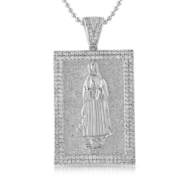 Mary textured rectangle medallion. Get this classic Christian religious piece with some modern bling bling. The stones are all prong set by hand. Rhodium plated to look and shine like an expensive pendant. Order your bling bling medallion today.