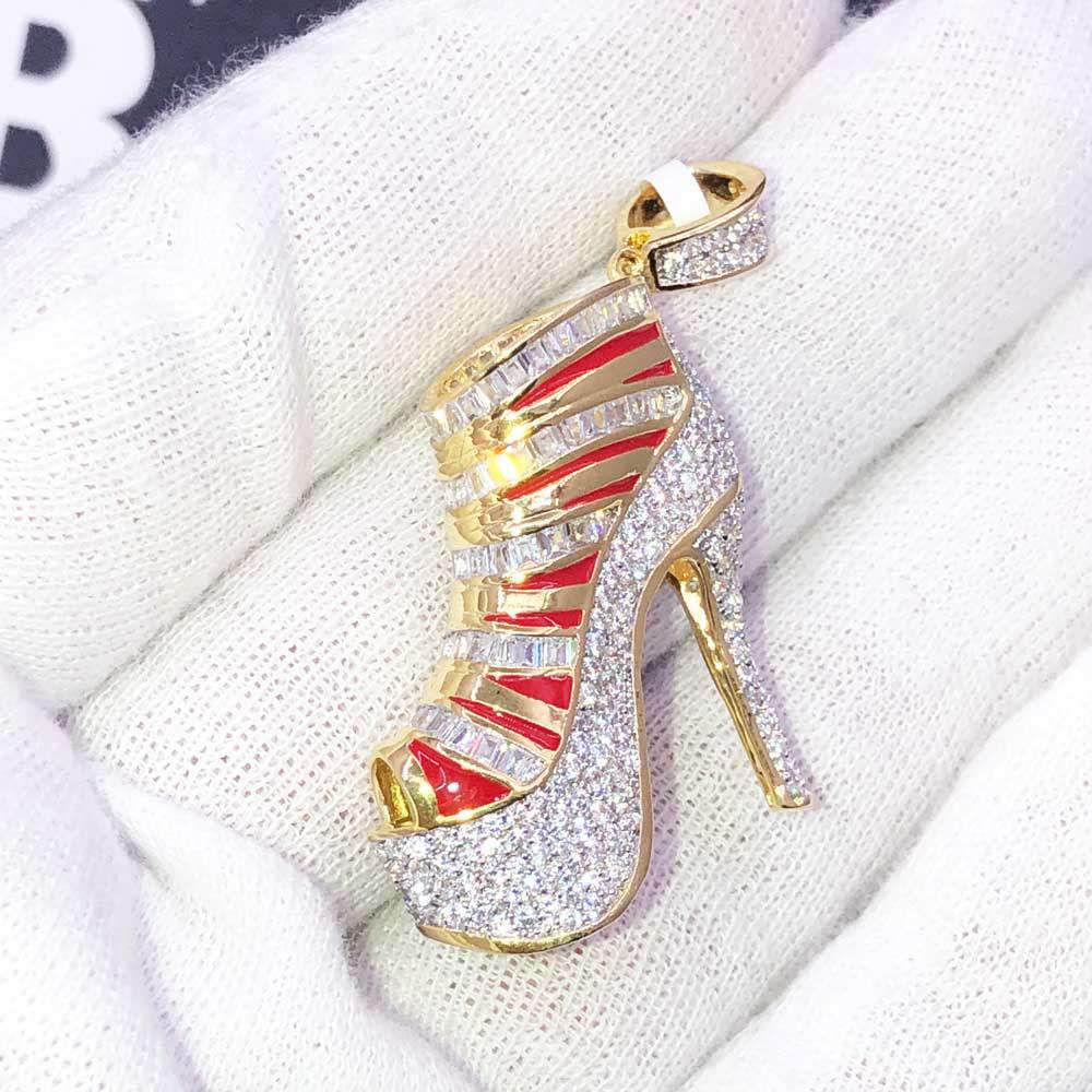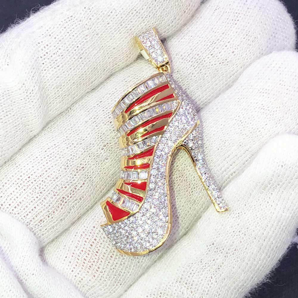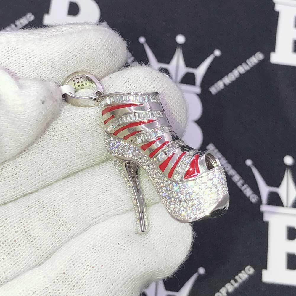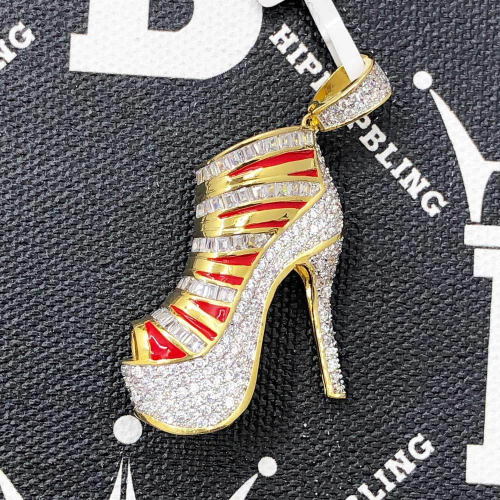 Stiletto High Heel 3D Shoe CZ Hip Hop Bling Bling Pendant. Limited Edition Iced Out Hip Hop Pendant. Stones are VVS Simulated Diamonds Prong Set, the same way genuine diamond hip hop jewelry is made. Stand out from the crowd with this this detailed quality made iced out pendant.