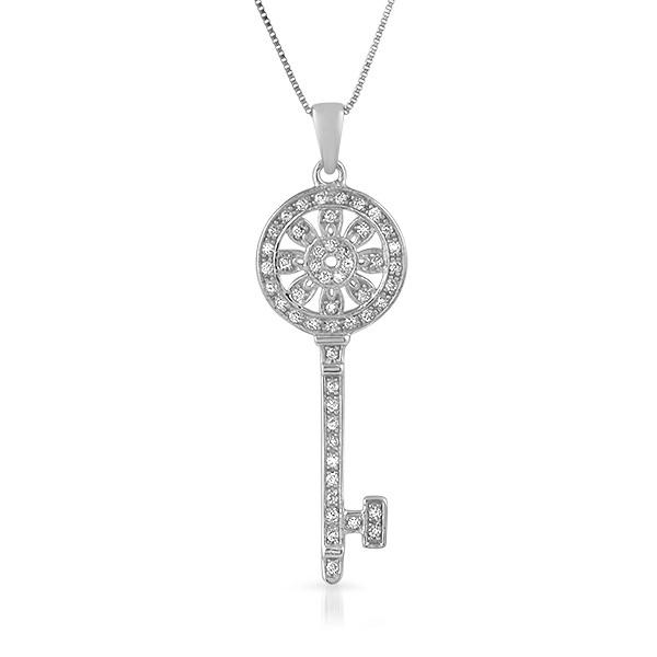 Sunflower Key micro pave silver pendant. Made with fine .925 sterling silver and plated with rhodium. The shiny stones are top grade CZ diamonds that look and bling real. The stones are all micro pave hand set. Fine details on this key pendant you can expect from high end fine diamond jewelry. We are offering this beautiful pendant at an amazing value. Order your Key pendant today.