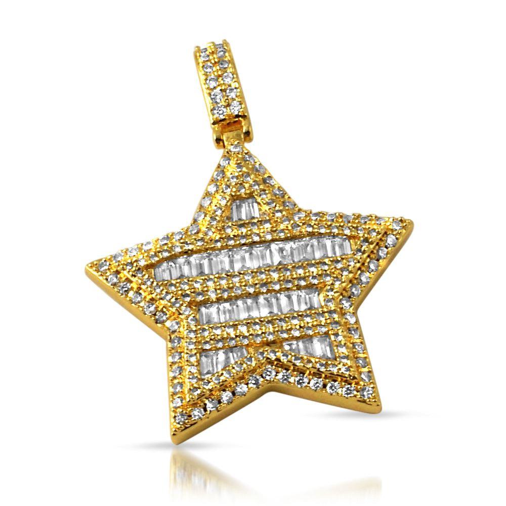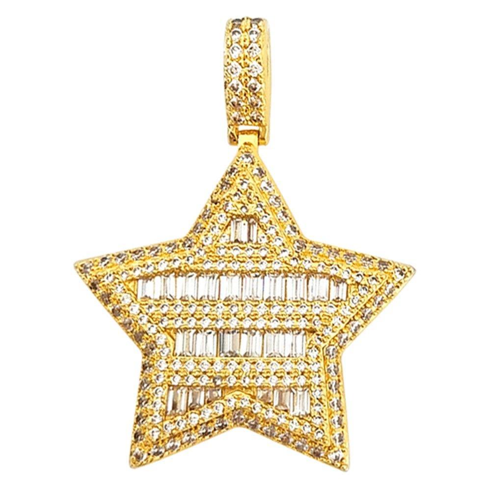 Super Star Baguette CZ Bling Bling Pendant in Gold.  This iced out simulated diamond pendant shines bright.  Each stone is set with prongs, no glue!  Elevate your swag and stand out from the crowd with this unique bling bling pendant around your neck.  Get the bustdown look and feel of a real diamond hip hop pendant for a fraction of the cost.  Quality finish and craftsmanship that is made to last.  Shine better and order today.