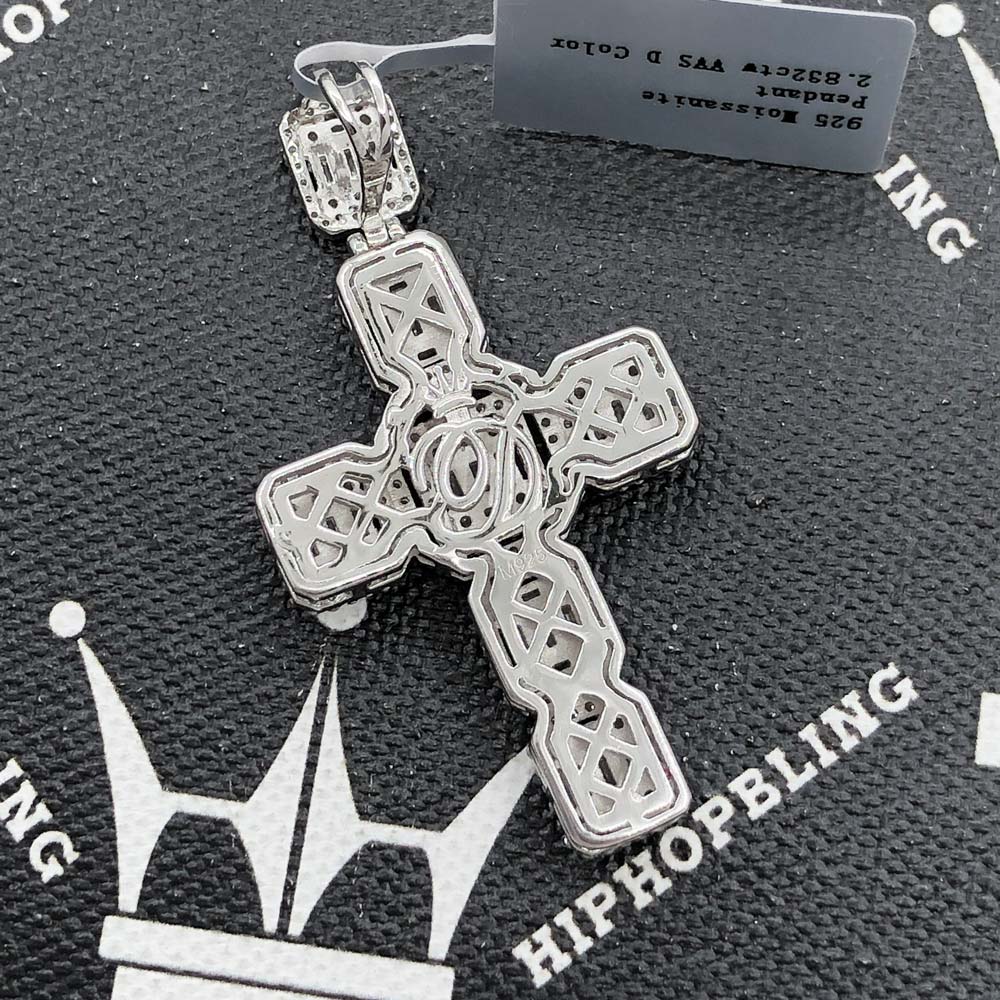 Cluster Cross Baguette 2.83cttw VVS Moissanite Pendant .925 Sterling Silver. This iced out Moissanite Pendant is simply breathtaking and displays an incredible bling bling shine. We insisted on using the finest Moissanite stones available to craft this perfect high end 'diamond' bling bling Moissanite Micro Pave Charm. Moissanite stones are carbon based stones just like real Diamonds. The benefit of our Moissanite hip hop jewelry is that you get a better shine for much less money than genuine Diamonds. Our Moissanite Stones have a higher refractive index than real Diamonds and rank 9-9.5 on Mohs hardness scale.