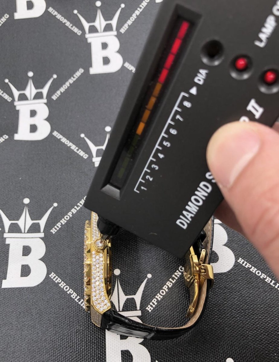 Moissanite Crown Iced Out Hip Hop Bling Bustdown Watch. Incredible attention to detail and craftsmanship on this watch. Looks and feels and shines like a high end designer diamond watch (and passes diamond testers too!). Full VVS Moissanite stone dial with baguette hour markers, stone crown, big boy bezel, case, and full iced out band. Over 1000 stones are prong set on this watch for a maximum bling bling shine on your wrist. These Moissanite stones shine almost identical to genuine natural diamonds and test positive on common diamond testers. Automatic 21 Jewel movement with sweeping second hand (no batteries or ticking) with glass observation back. Crafted from Stainless Steel Metal for long lasting durability. Each stone is prong set by machine for precise beautiful stone setting that will ice out your wrist to the max. Watch band links are assembled with screw pins, not cheap push in pins. Stay iced up with this popular style bling bling watch around your wrist. Quality made so it looks like you got $25,000 on your wrist. Order yours today as stock is limited.