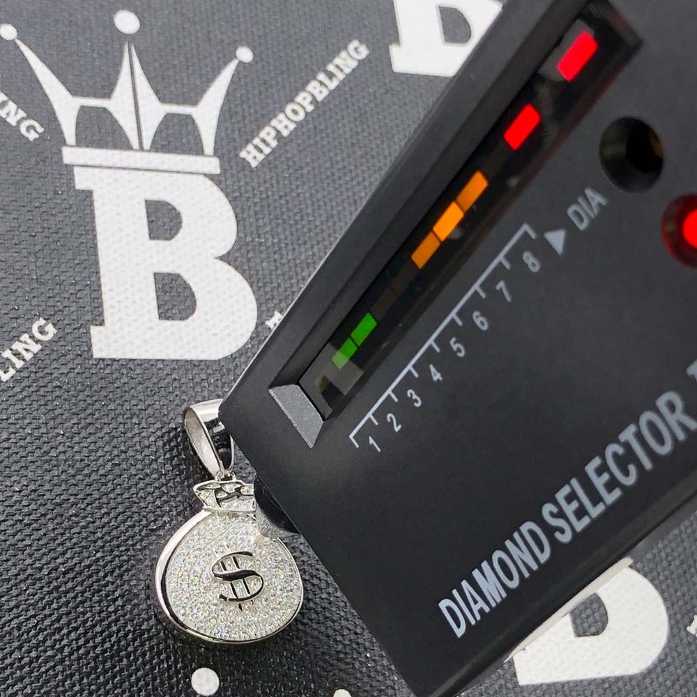 Money Bag VVS Moissanite Pendant .925 Sterling Silver.  This iced out Moissanite Pendant is simply breathtaking and displays an incredible bling bling shine.  We insisted on using the finest Moissanite stones available to craft this perfect high end 'diamond' bling bling Moissanite Micro Pave Charm.  Moissanite stones are carbon based stones just like real Diamonds.  The benefit of our Moissanite hip hop jewelry is that you get a better shine for much less money than genuine Diamonds.  Our Moissanite Stones have a higher refractive index than real Diamonds and rank 9-9.5 on Mohs hardness scale.
