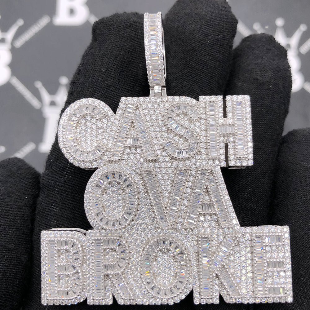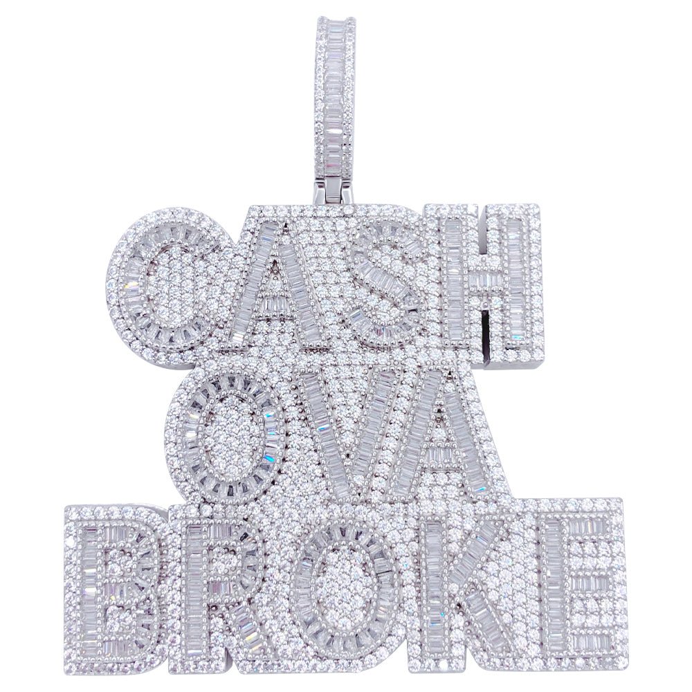 .925 Silver CASH OVA BROKE VVS CZ Iced Out Pendant. Crafted from real Solid .925 Sterling Silver with an incredible bling bling shine. Limited Edition Iced Out Hip Hop Pendant. Stones are VVS Simulated Diamonds Prong Set, the same way genuine diamond hip hop jewelry is made. Get the same look, feel and shine for less on real Silver. Stand out from the crowd with this this detailed quality made iced out pendant.