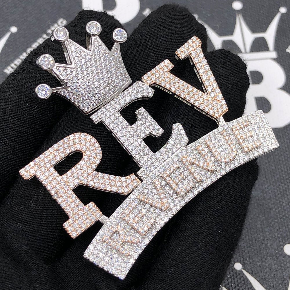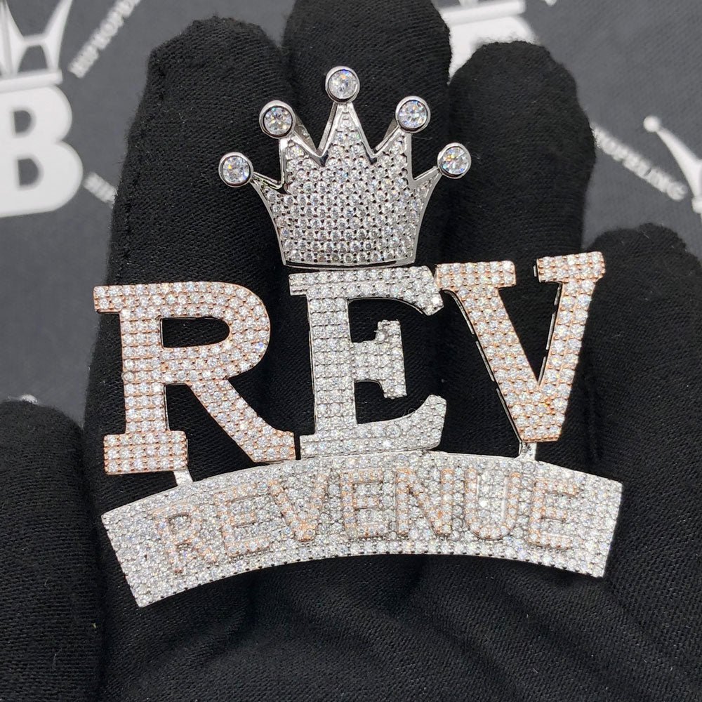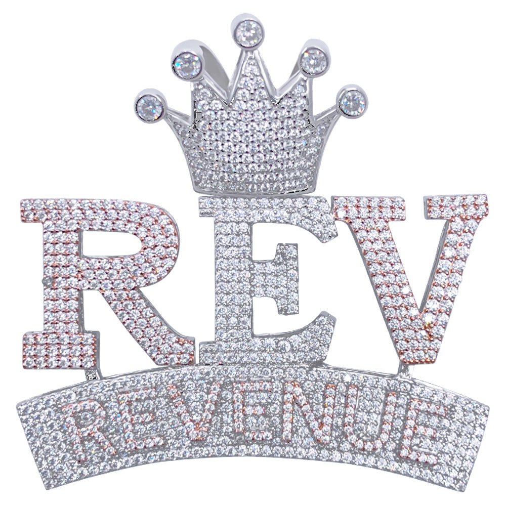 .925 Sterling Silver REV Revenue VVS CZ Iced Out Pendant.  Crafted from real Solid .925 Sterling Silver with an incredible bling bling shine.  Limited Edition Iced Out Hip Hop Pendant.  Stones are VVS Simulated Diamonds Prong Set, the same way genuine diamond hip hop jewelry is made.  Get the same look, feel and shine for less on real Silver.  Stand out from the crowd with this this detailed quality made iced out pendant.