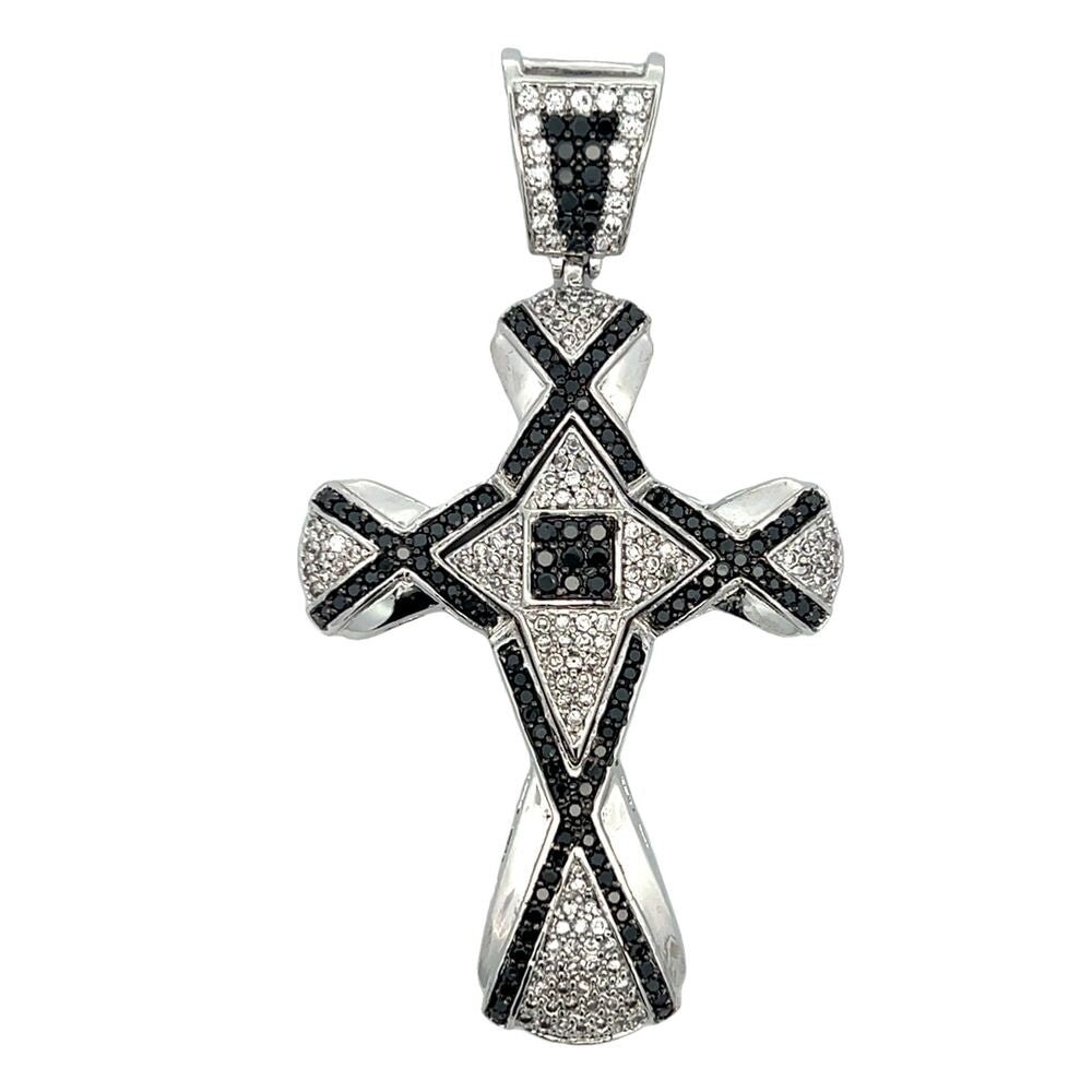 Ribbon Cross Black & White CZ Iced Out Pendant. This hip hop pendant features round cut simulated diamond stones giving this bling bling charm a unique shine and look to it. Beautifully crafted with precision stone setting. Hot style iced out Pendant that is unique and stands out from the crowd. The VVS CZ Simulated Diamonds have a bling bling shine as if they were genuine diamonds.