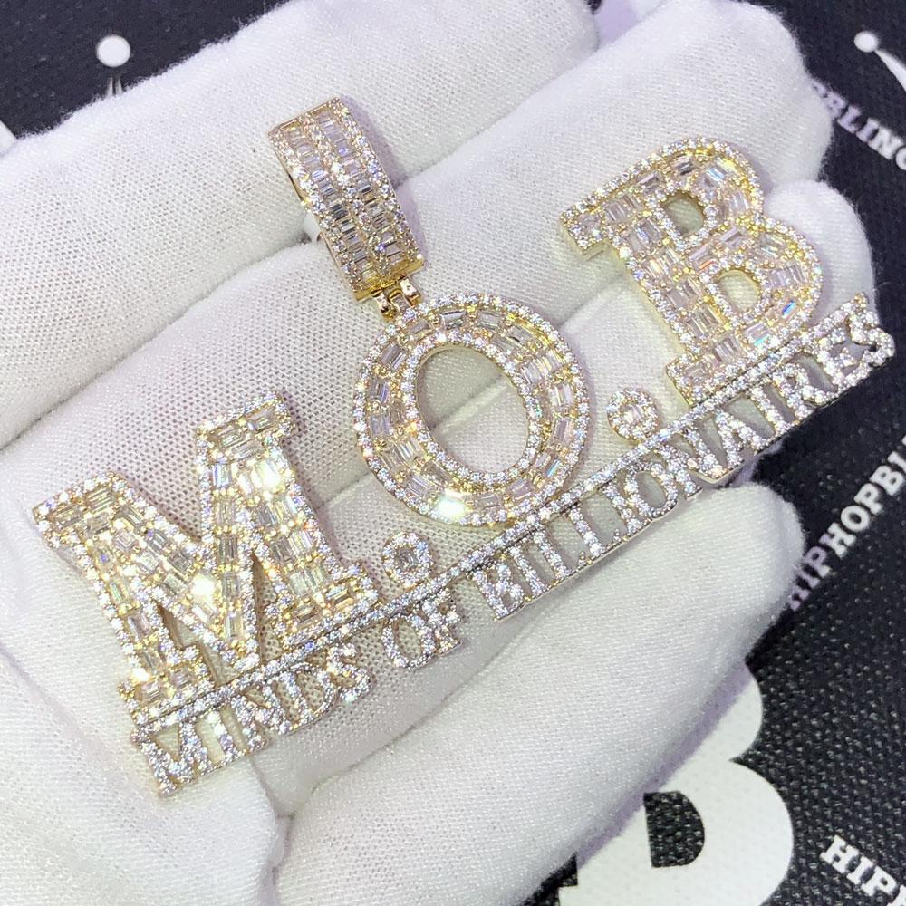 MOB Mind of Billionaires Baguette CZ Iced Out Pendant. Limited Edition Iced Out Hip Hop Pendant. Stones are Round Cut and Baguette Cut VVS Simulated Diamonds Prong Set, the same way genuine diamond hip hop jewelry is made. Stand out from the crowd with this this detailed quality made bling bling iced out pendant.