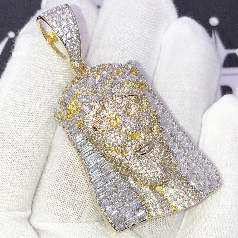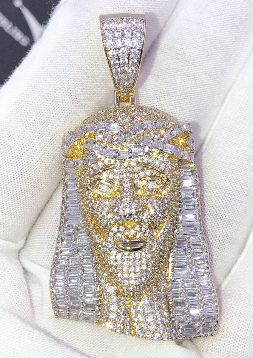 Baguette Jesus Piece Hip Hop CZ Iced Out Pendant. Limited Edition Iced Out Hip Hop Pendant. Stones are Round Cut VVS Simulated Diamonds Prong Set, the same way genuine diamond hip hop jewelry is made. Stand out from the crowd with this this detailed quality made bling bling iced out pendant.