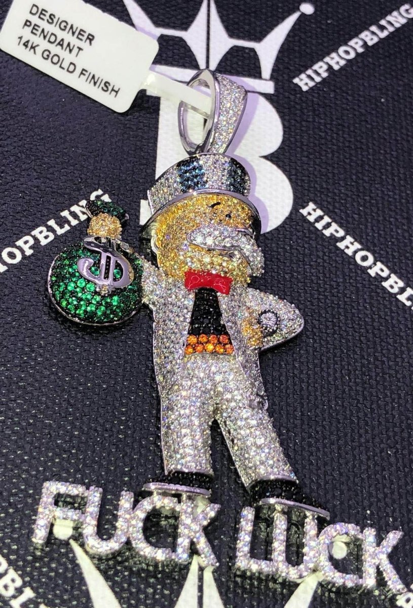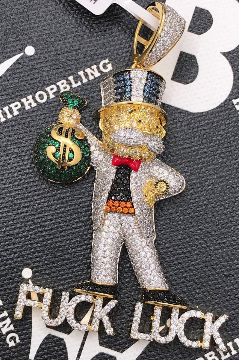 F*** Luck Money Man CZ Hip Hop Bling Bling Pendant. Limited Edition Iced Out Hip Hop Pendant. Stones are VVS Simulated Diamonds Prong Set, the same way genuine diamond hip hop jewelry is made. Stand out from the crowd with this this detailed quality made iced out pendant.
