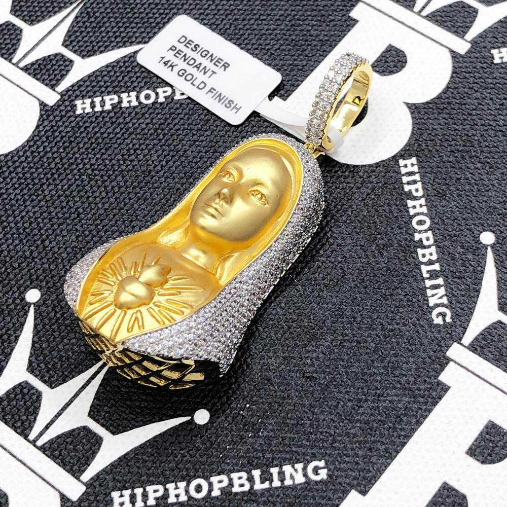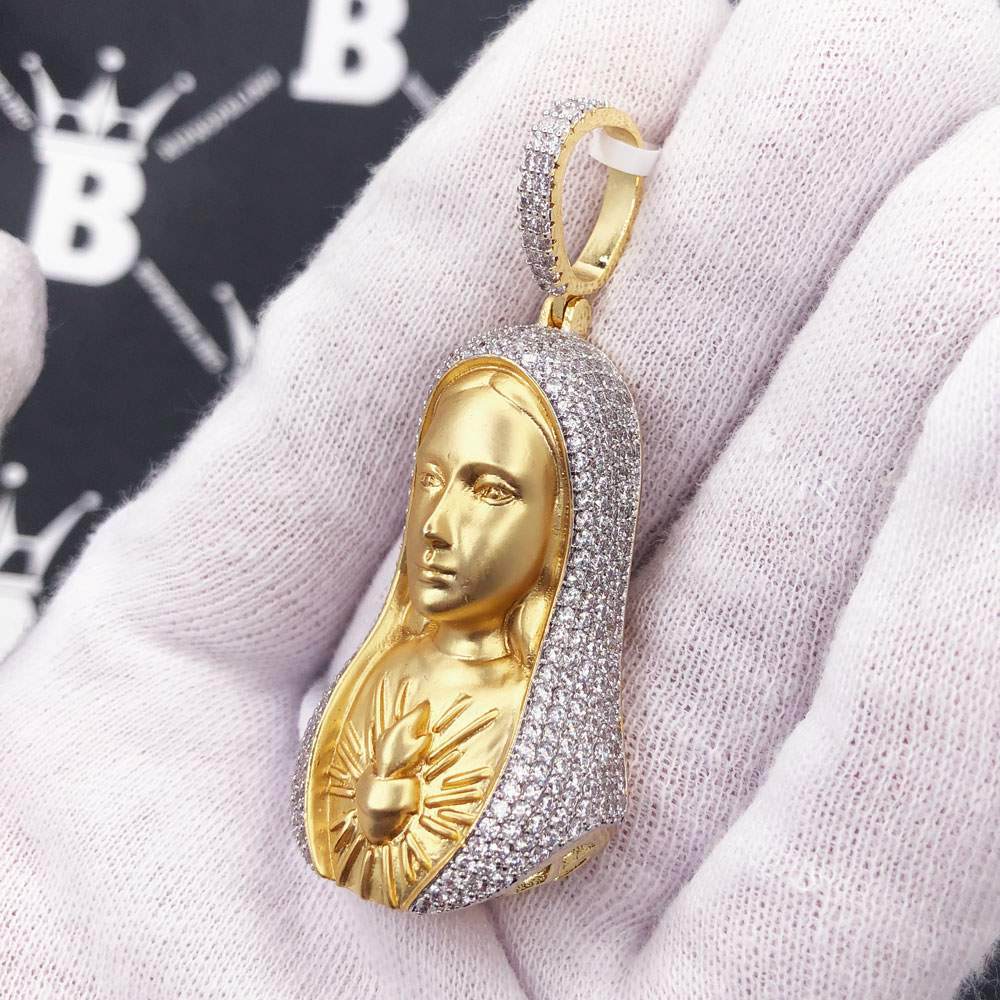 Sacred Heart of Mary CZ Hip Hop Bling Bling Pendant. Limited Edition Iced Out Hip Hop Pendant. Stones are VVS Simulated Diamonds Prong Set, the same way genuine diamond hip hop jewelry is made. Stand out from the crowd with this this detailed quality made iced out pendant.
