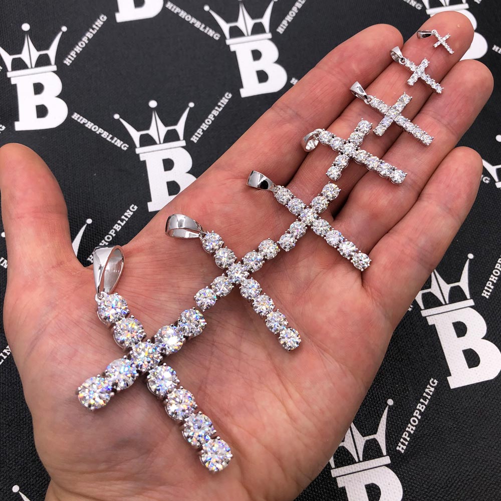 Tennis Cross VVS Moissanite Pendant .925 Sterling Silver. This iced out Moissanite Tennis Cross Pendant is simply breathtaking and displays an incredible bling bling shine. We insisted on using the finest Moissanite stones available to craft this perfect high end 'diamond' bling bling Moissanite Micro Pave Cross Charm. Moissanite stones are carbon based stones just like real Diamonds. The benefit of our Moissanite hip hop jewelry is that you get a better shine for much less money than genuine Diamonds. Our Moissanite Stones have a higher refractive index than real Diamonds and rank 9-9.5 on Mohs hardness scale.