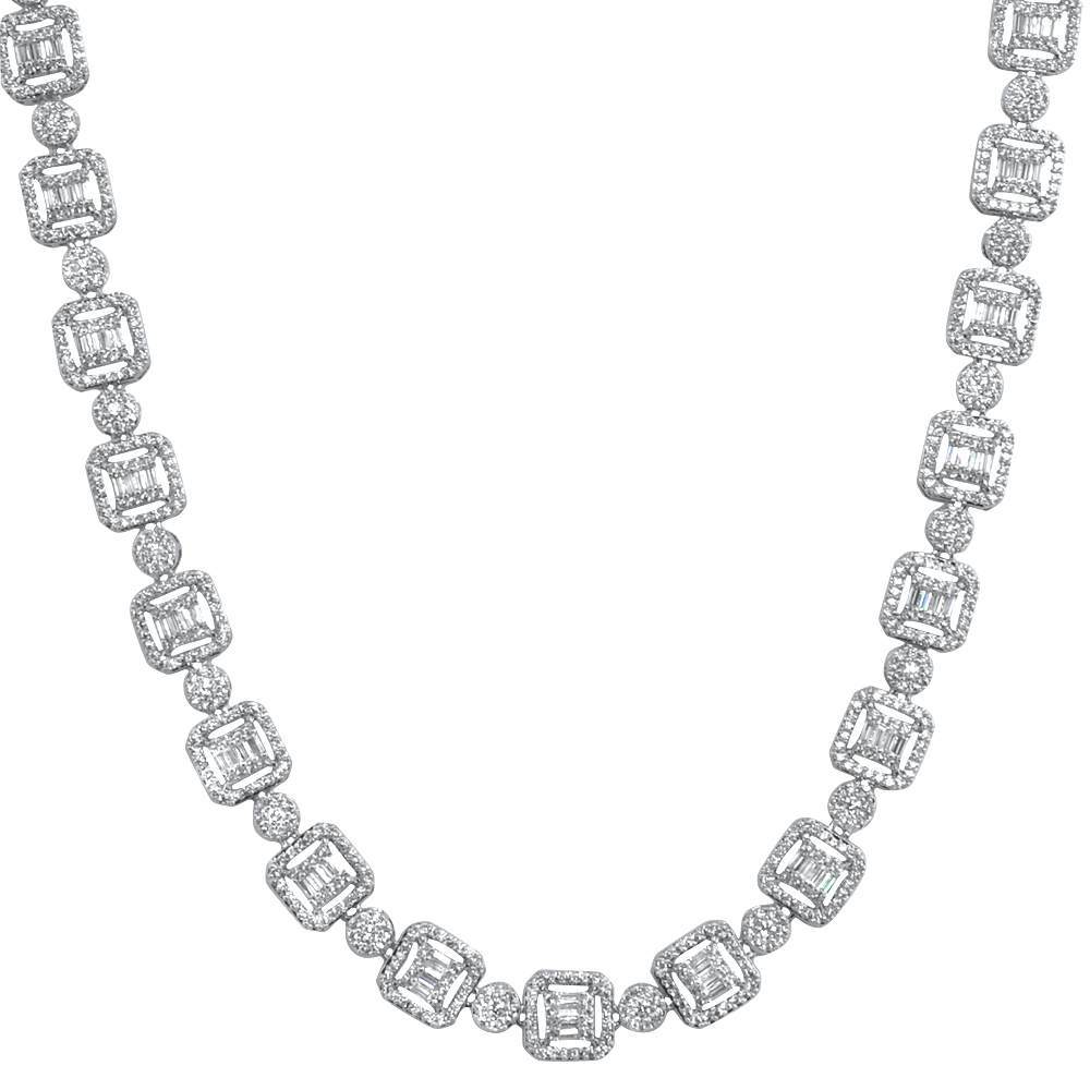 Uniquely crafted Baguette & Cluster Alternating Link Bling Bling Chain. Made with .925 Sterling Silver. Highly detailed with intricate details and stone setting. All stones are VVS Simulated Diamonds that are prong set. This Hip Hop Chain is sure to turn heads. Measures 13MM Wide.