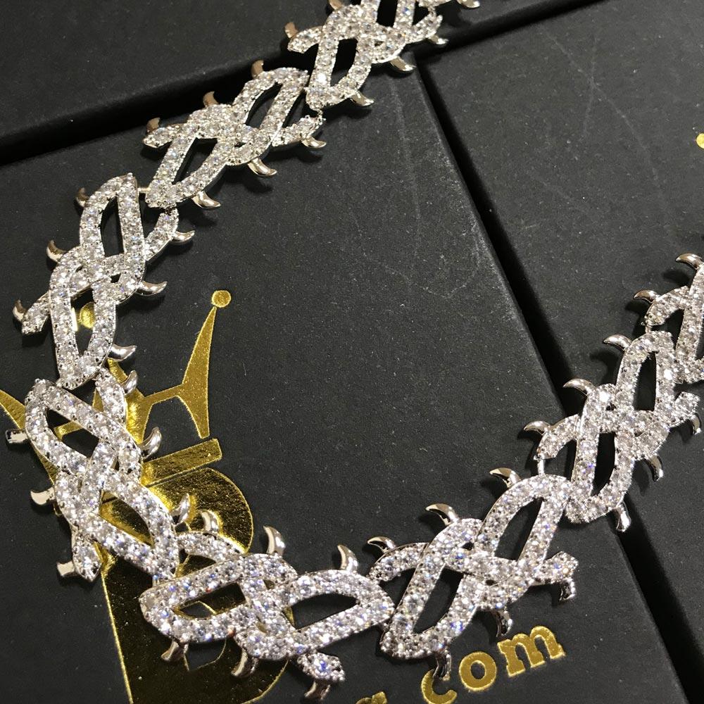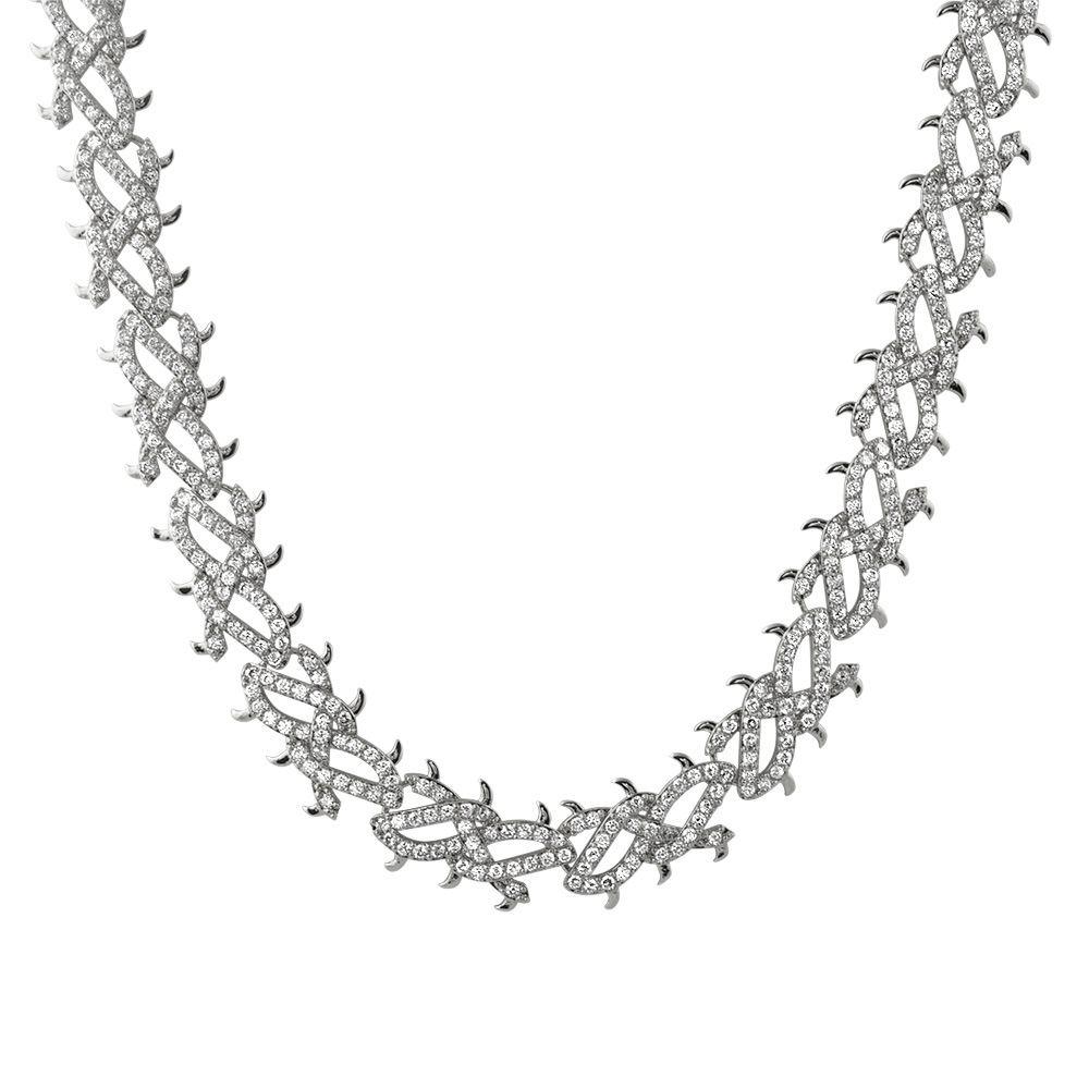 Uniquely crafted "Crown of Thorns" design Bling Bling Chain. Modeled after the Crown of thorns on Jesus. Highly detailed with sharp details. All stones are VVS Simulated diamonds that are prong set. This Hip Hop Chain is sure to turn heads. Measures 15MM Wide from thorn to thorn. White Gold Plated to look like Platinum at a fraction of the cost. Get yours and Order today.