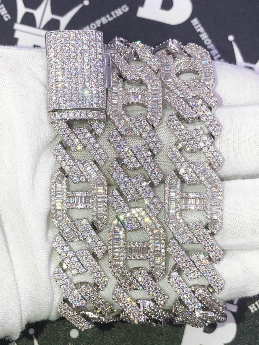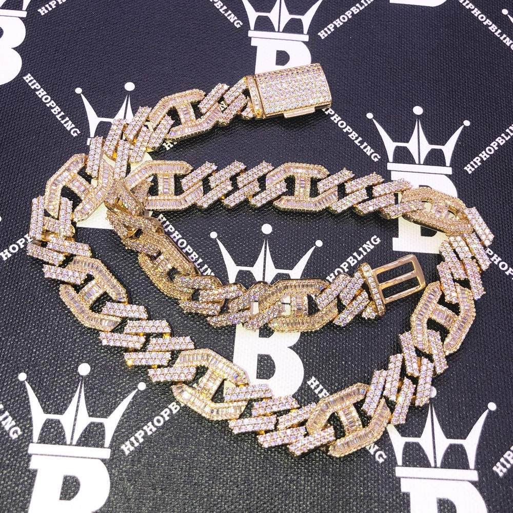 Sharp Mariner Figaro Bling Bling CZ Iced Out Chain. This classic iced out Mariner chain modernized with sharp cuban links, baguette mariner link to create a unique figaro bling bling chain. Highly detailed with intricate details and stone setting. All stones are VVS Simulated Diamonds that are prong set.