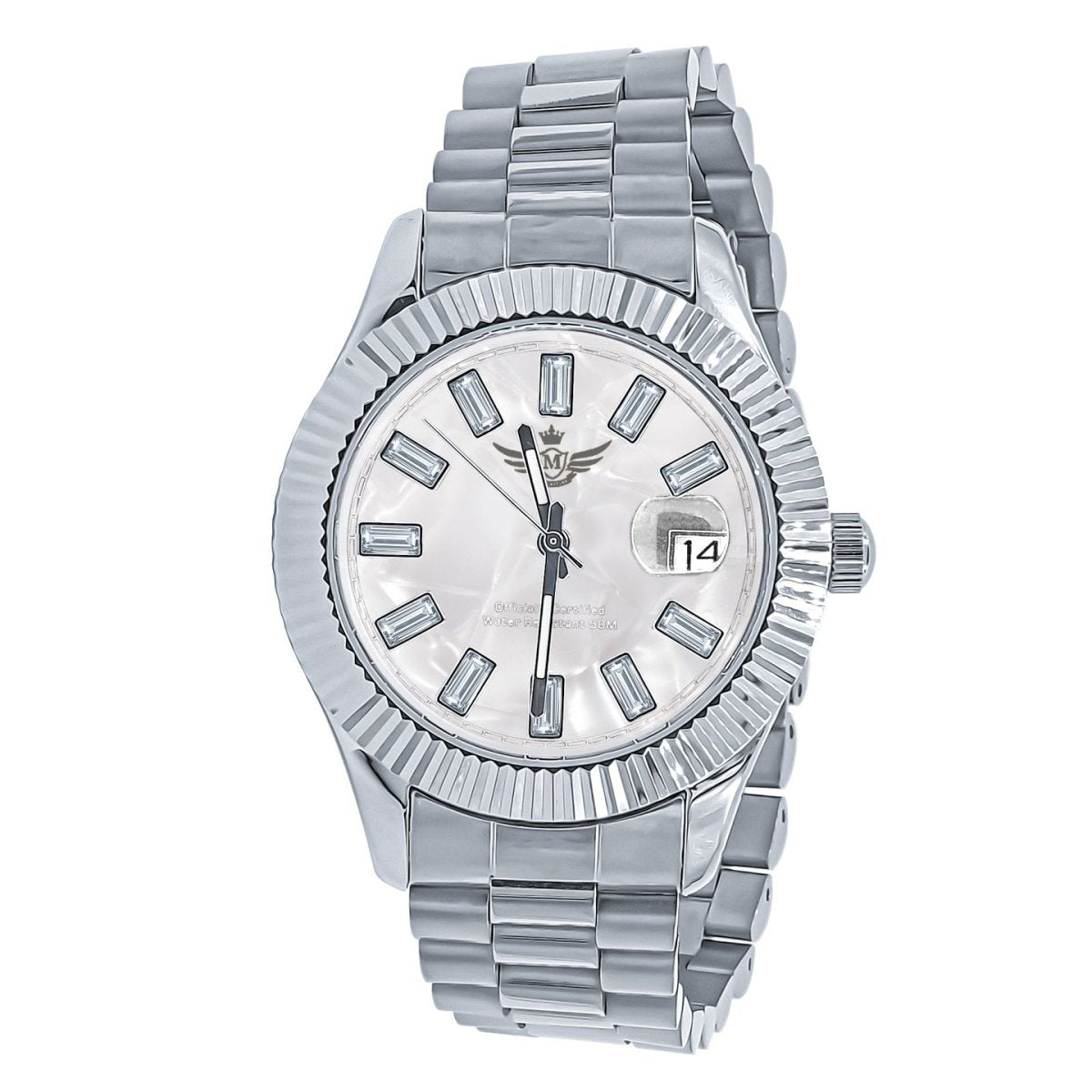Clean 41MM CZ Baguette Hours Date Watch. Incredible attention to detail and craftsmanship on this watch. Looks and feels and shines like a high end designer diamond watch. Crafted from Stainless Steel Metal for long lasting durability. Each stone is prong set by machine for precise beautiful stone setting that will leave you breathless. Stay iced up with this popular style bling bling watch around your wrist. Quality made so it looks like you got $50,000 on your wrist. Order yours today as stock is limited.