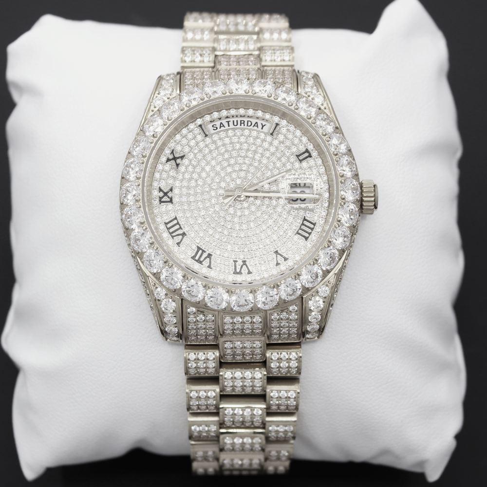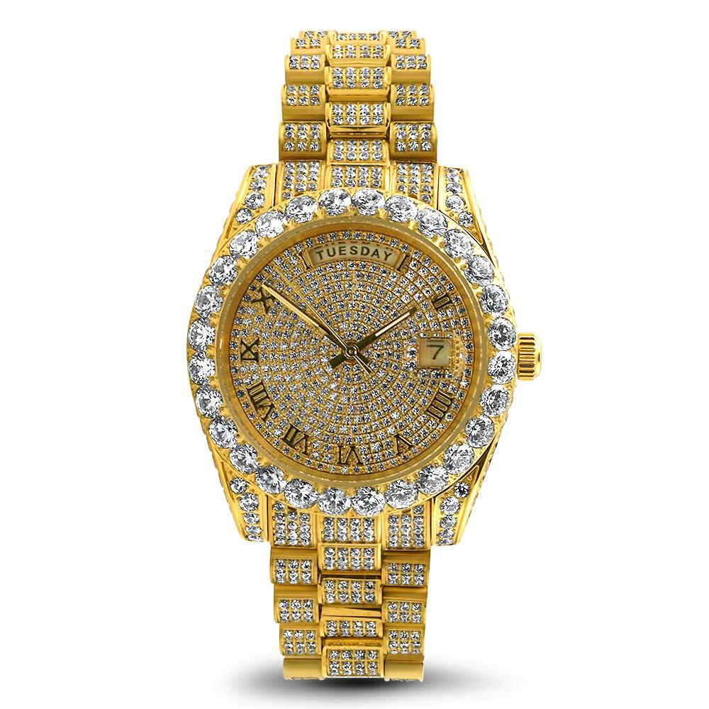 Features - Date and Day Function, Prong Set CZ Simulated Diamonds, Full Stone Dial, Big Rocks Domed Bezel, Case, and Iced Out Band.