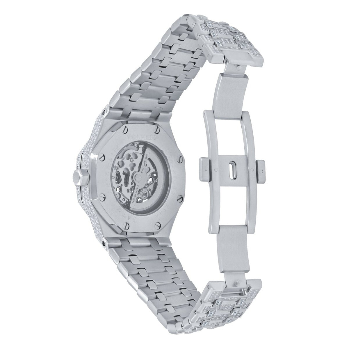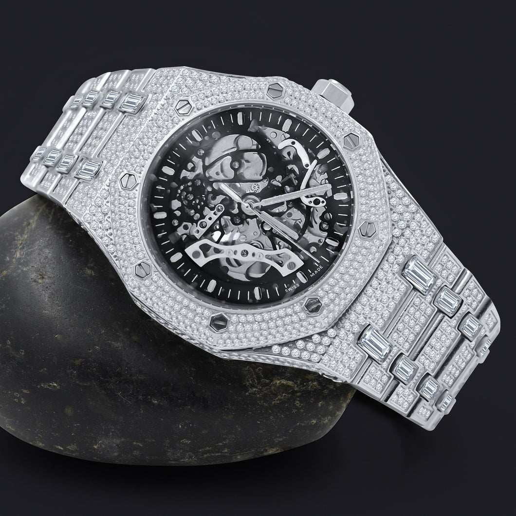 Skeleton Micro Pave Stainless Steel CZ Watch. Crafted from Stainless Steel Metal for long lasting durability. Each stone is set by machine for precise beautiful stone setting that will leave you breathless. Stay iced up with this popular style bling bling watch around your wrist. Quality made so it looks like you got $75,000 on your wrist. Order yours today as stock is limited.