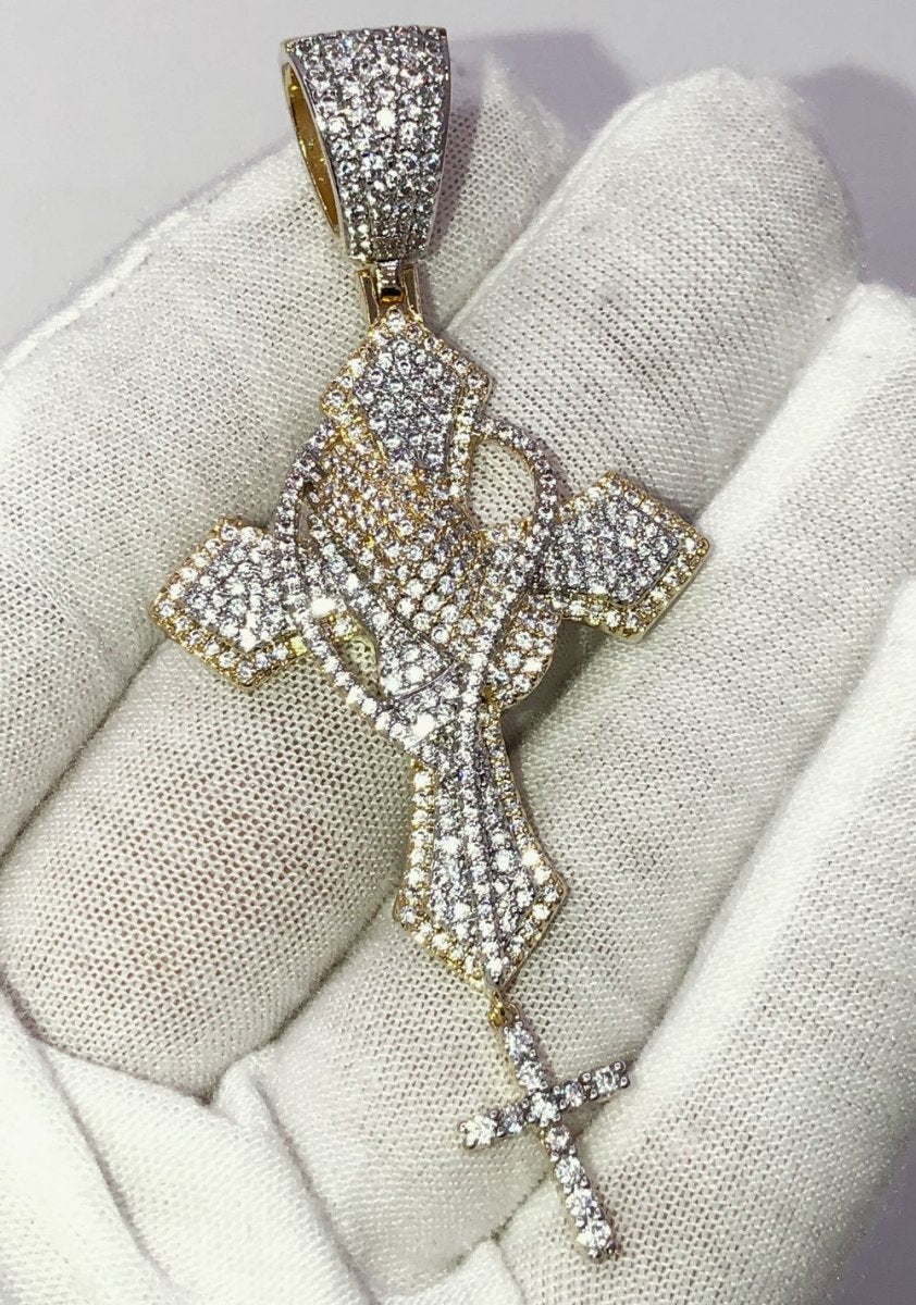 Sharp Prayer Dangling Cross VVS CZ Hip Hop Iced Out Pendant. Limited Edition Iced Out Hip Hop Pendant. Stones are VVS Simulated Diamonds Prong Set, the same way genuine diamond hip hop jewelry is made. Stand out from the crowd with this this detailed quality made iced out pendant.