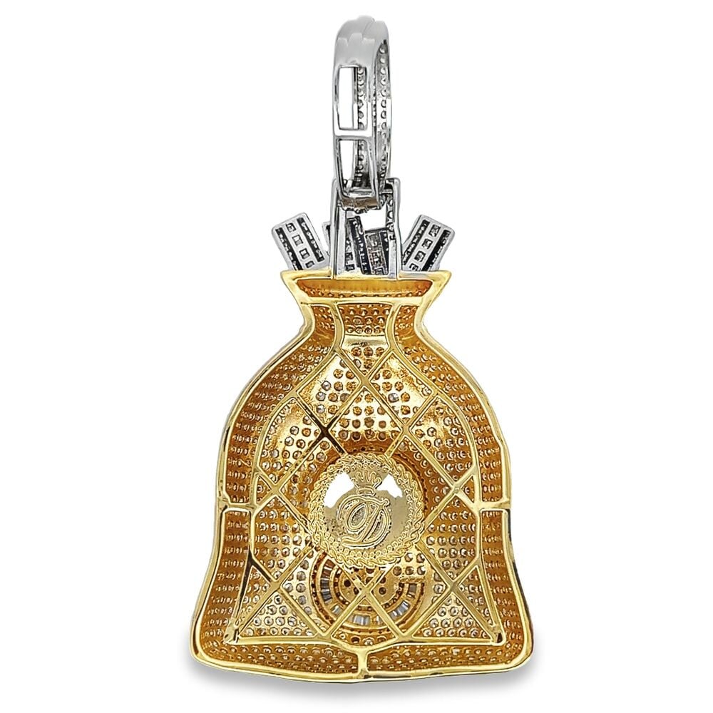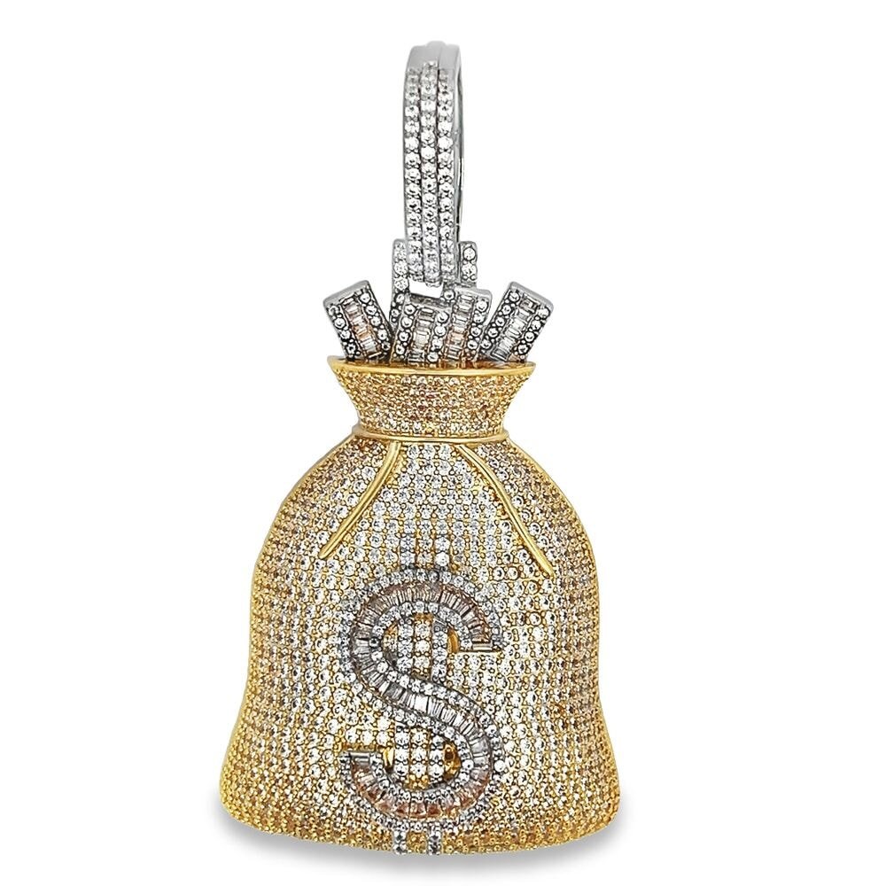 Baguette Money Bag Large CZ Hip Hop Iced Out Pendant. Limited Edition Iced Out Hip Hop Pendant. Stones are VVS Simulated Diamonds Prong Set, the same way genuine diamond hip hop jewelry is made. Stand out from the crowd with this this detailed quality made iced out pendant.