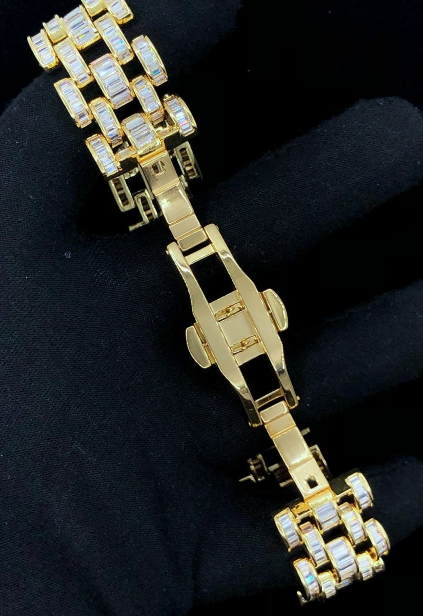 Baguette Jubilee CZ Iced Out Hip Hop Bling Bracelet. Features Channel Set Baguette stones in a domed pattern throughout the entire bracelet. Classic and Unique Style Bling Bling Bracelet. Incredibly icy with VVS simulated diamond stones lighting up your wrist with the best shine possible. This iced out Bracelet shines like genuine diamonds. All hand setting, no glue. Hand Crafted to look, feel, and Shine Like Genuine Diamond Hip Hop Jewelry. Shine with the best hip hop jewels in the game.