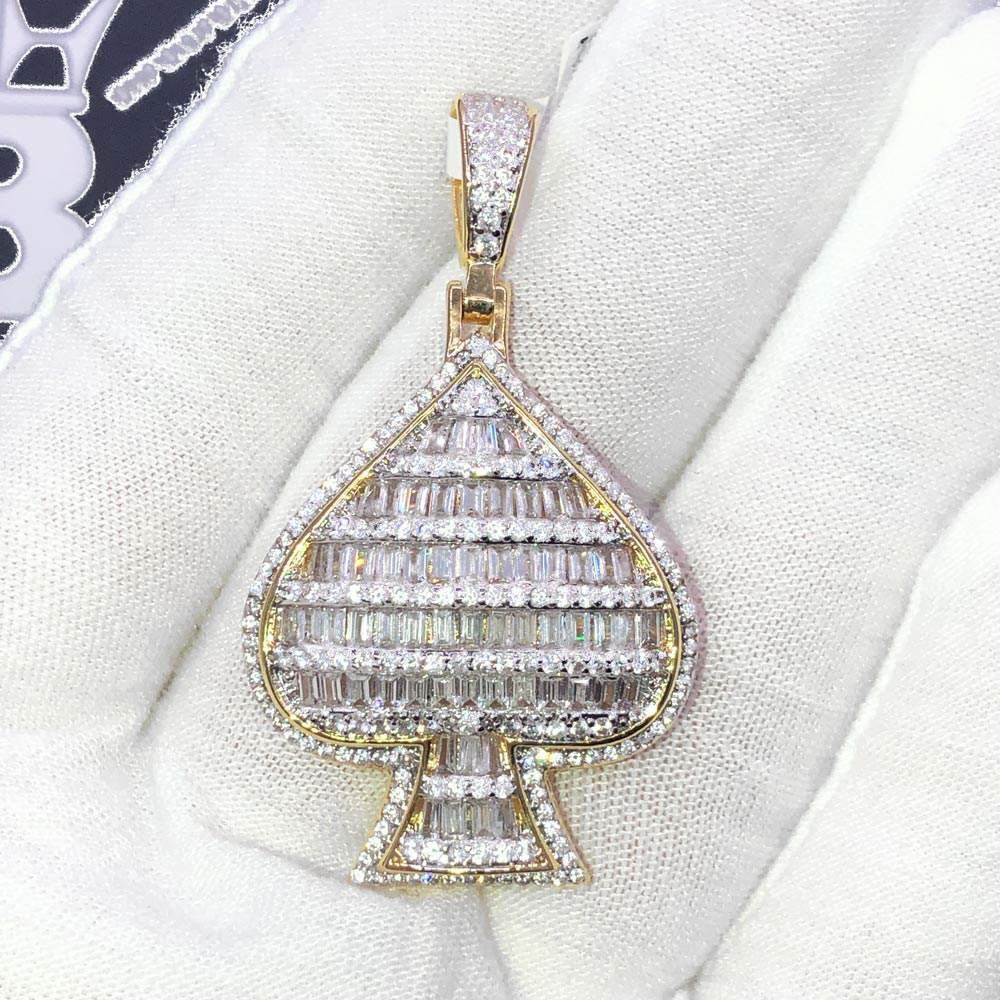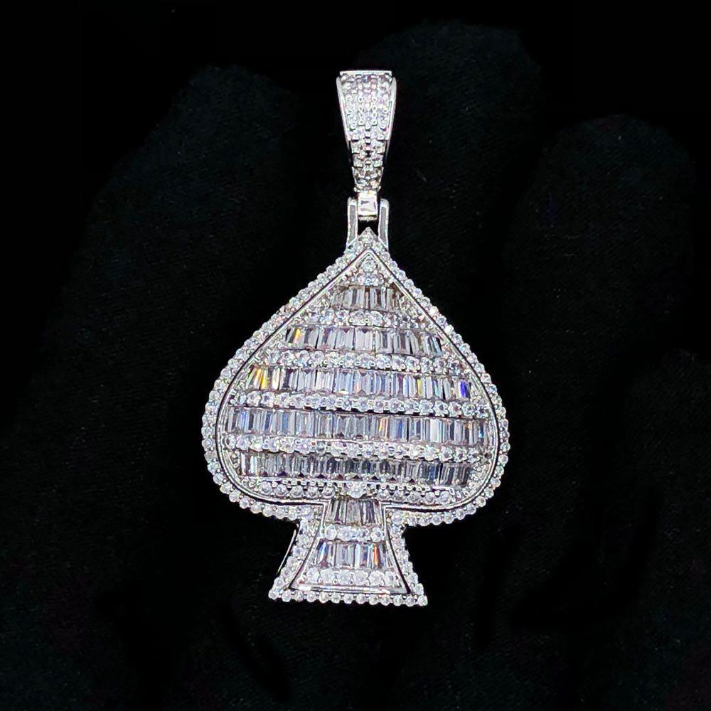 Baguette Spade Medium Poker CZ Hip Hop Bling Bling Pendant. Limited Edition Iced Out Hip Hop Pendant. Stones are VVS Simulated Diamonds Prong Set, the same way genuine diamond hip hop jewelry is made. Stand out from the crowd with this this detailed quality made iced out pendant.