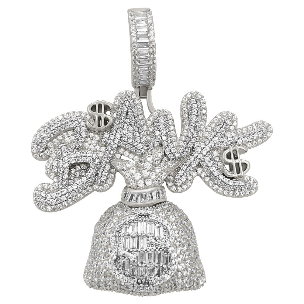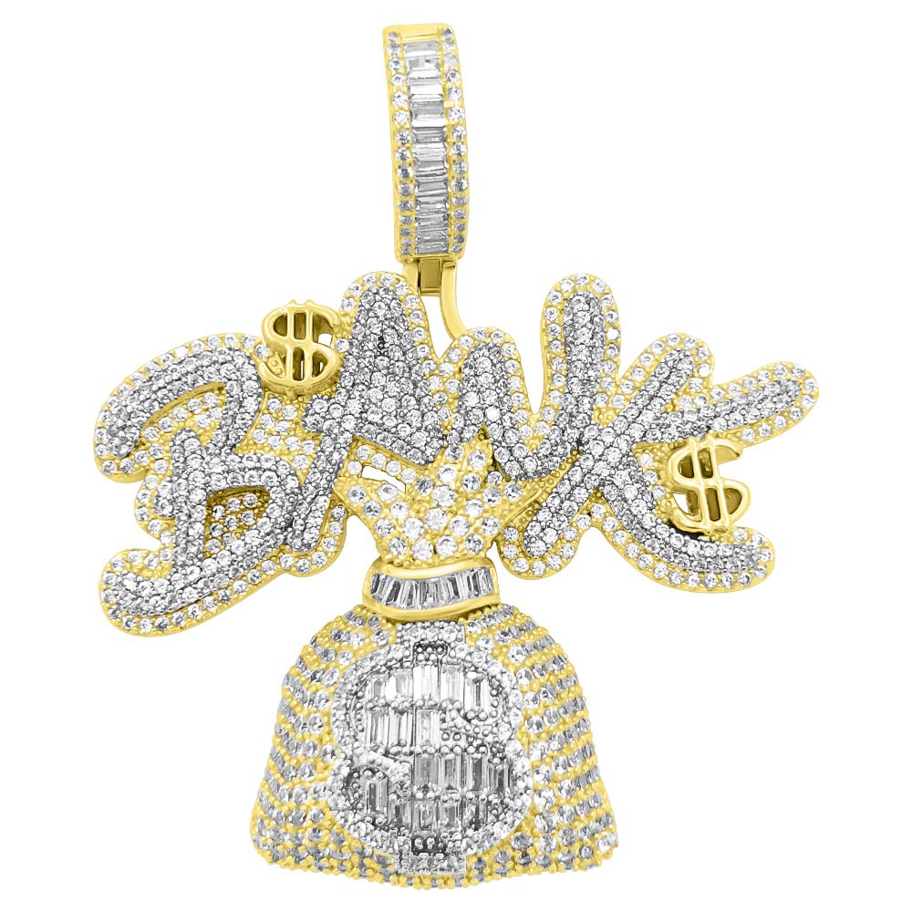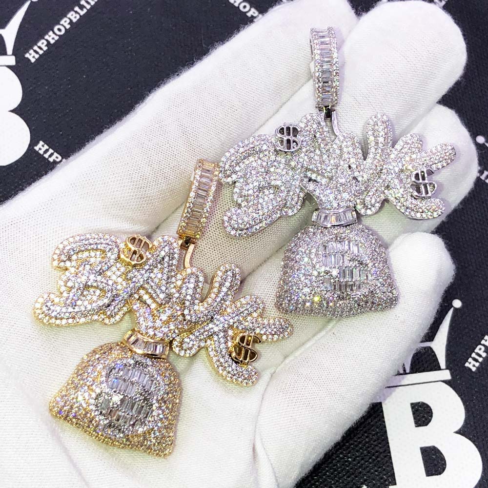Bank Money Bag Baguette VVS CZ Hip Hop Iced Out Pendant. Limited Edition Iced Out Hip Hop Pendant. Stones are VVS Simulated Diamonds Prong Set, the same way genuine diamond hip hop jewelry is made. Stand out from the crowd with this this detailed quality made iced out pendant.