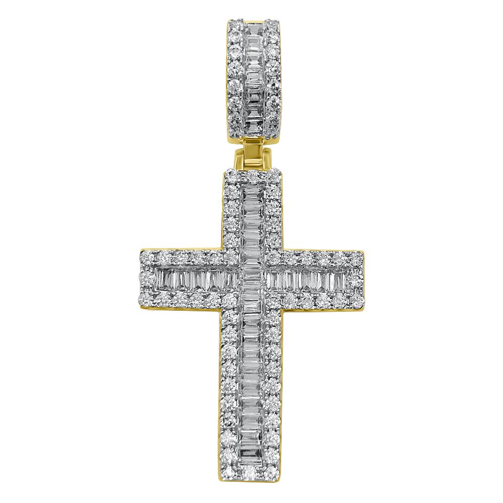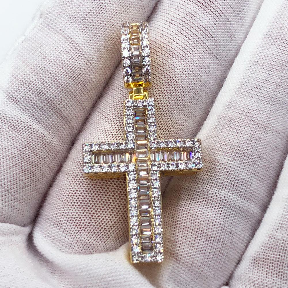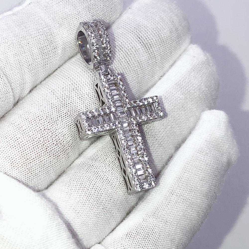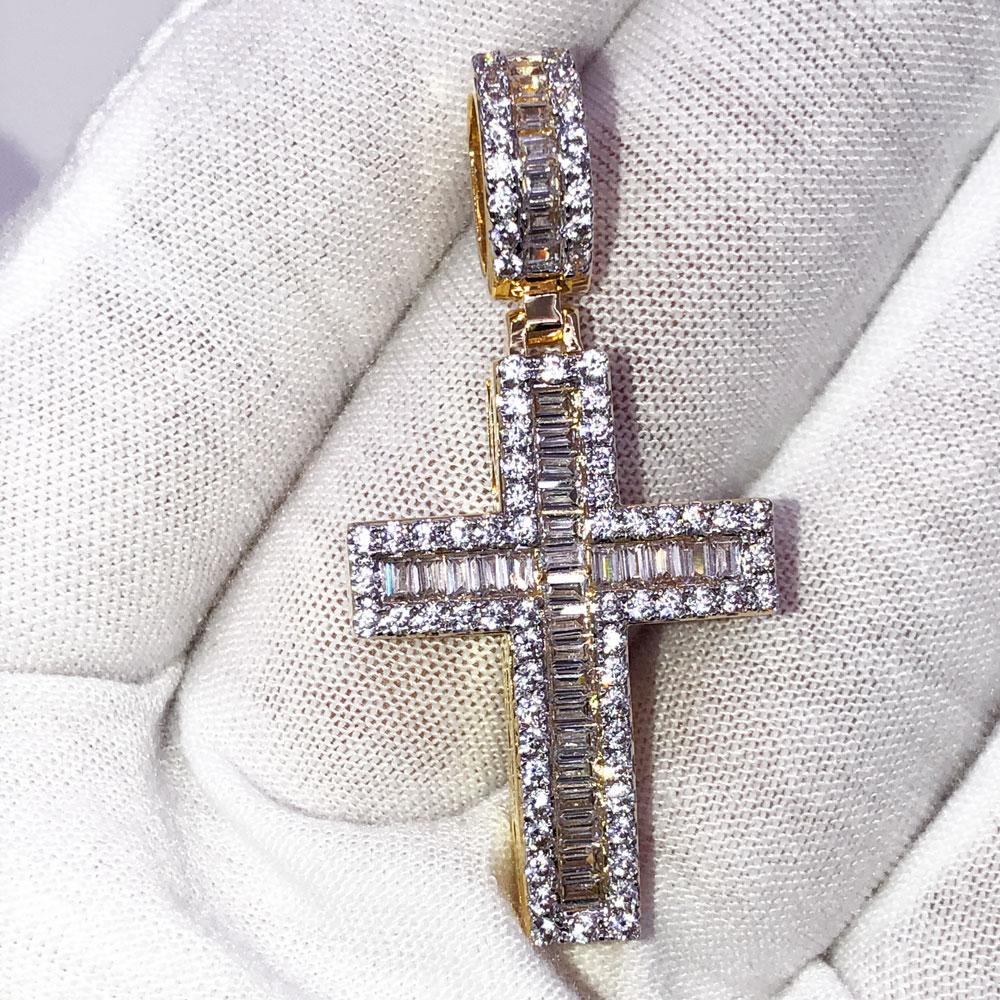 Channel Baguette Cross VVS CZ Hip Hop Iced Out Pendant. Limited Edition Iced Out Hip Hop Pendant. Stones are Round Cut and Baguette Cut VVS Simulated Diamonds Prong Set, the same way genuine diamond hip hop jewelry is made. Stand out from the crowd with this this detailed quality made iced out pendant.