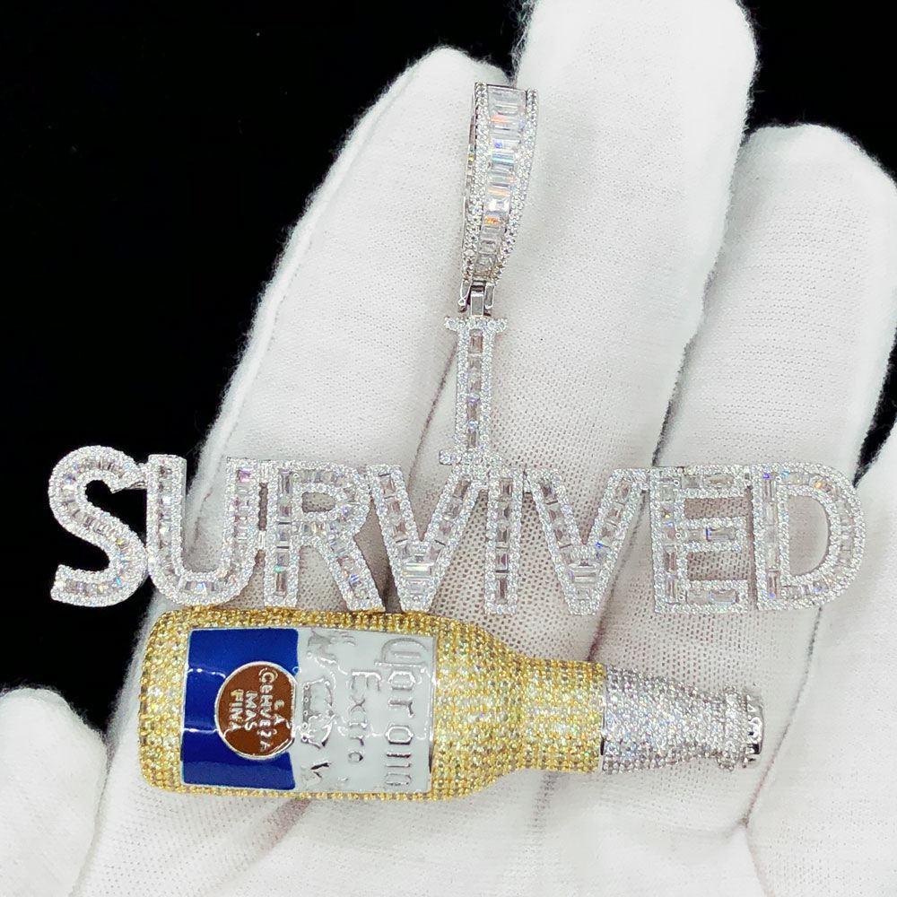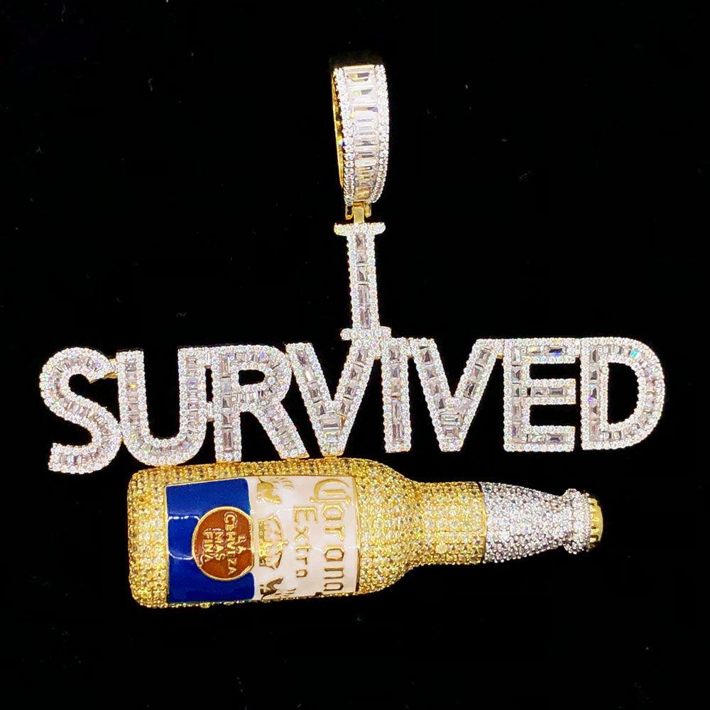I Survived Corona Baguette CZ Hip Hop Bling Bling Pendant. Limited Edition Iced Out Hip Hop Pendant. Stones are VVS Simulated Diamonds Prong Set, the same way genuine diamond hip hop jewelry is made. Stand out from the crowd with this this detailed quality made iced out pendant.