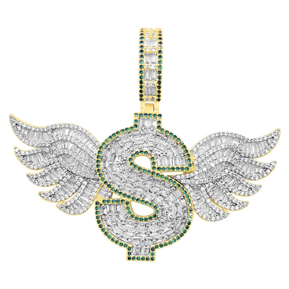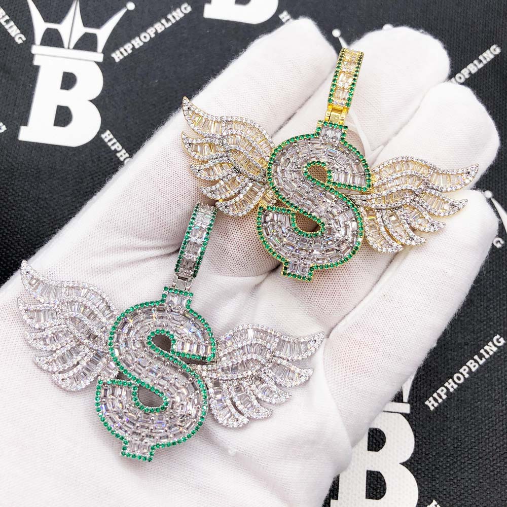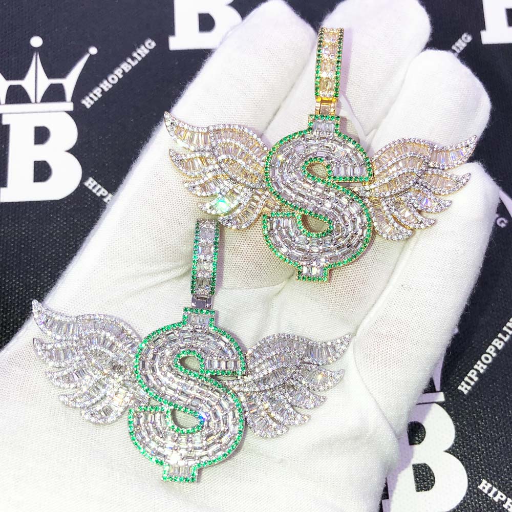 Money Sign Wings Baguette VVS CZ Hip Hop Iced Out Pendant. Limited Edition Iced Out Hip Hop Pendant. Stones are VVS Simulated Diamonds Prong Set, the same way genuine diamond hip hop jewelry is made. Stand out from the crowd with this this detailed quality made iced out pendant.