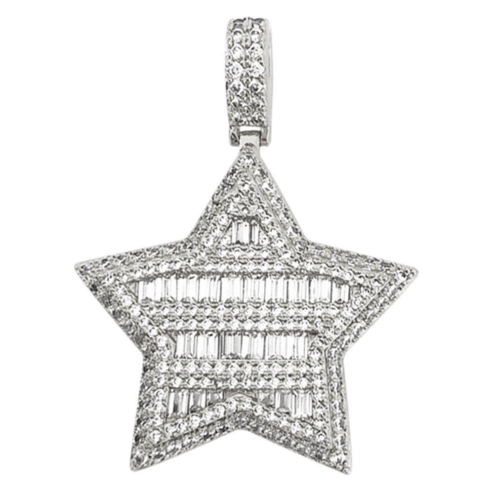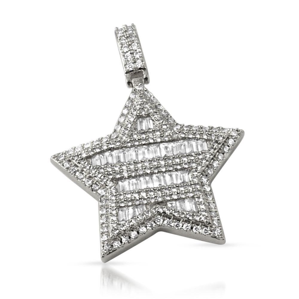 Super Star Baguette CZ Bling Bling Pendant in Rhodium. This iced out simulated diamond pendant shines bright. Each stone is set with prongs, no glue! Elevate your swag and stand out from the crowd with this unique bling bling pendant around your neck. Get the bustdown look and feel of a real diamond hip hop pendant for a fraction of the cost. Quality finish and craftsmanship that is made to last. Shine better and order today.