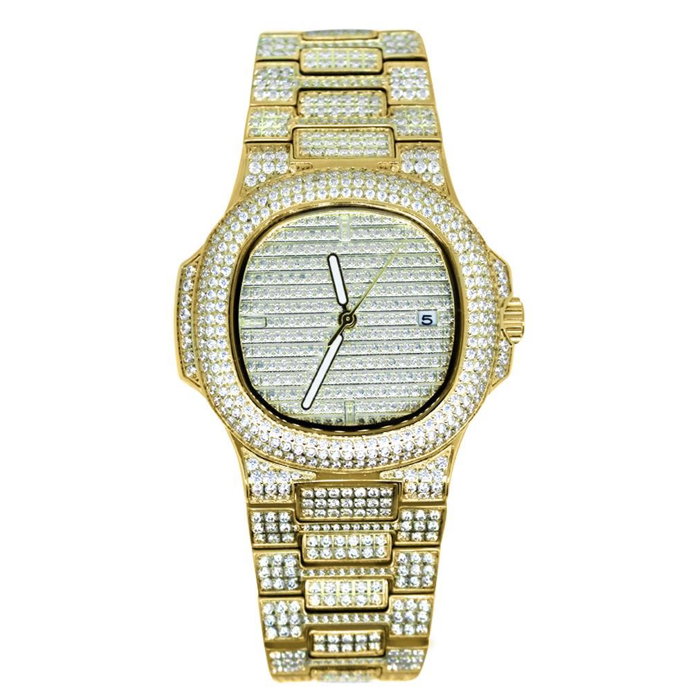 High End Modern Hip Hop Bling Bling Watch. Crafted from Stainless Steel Metal for long lasting durability. Each stone is set by machine for precise beautiful stone setting that will leave you breathless. High tech Gold bonding will make this watch last and last. Stay iced up with this popular style bling bling watch around your wrist. Quality made so it looks like you got $75k on your wrist. Order yours today as stock is limited.