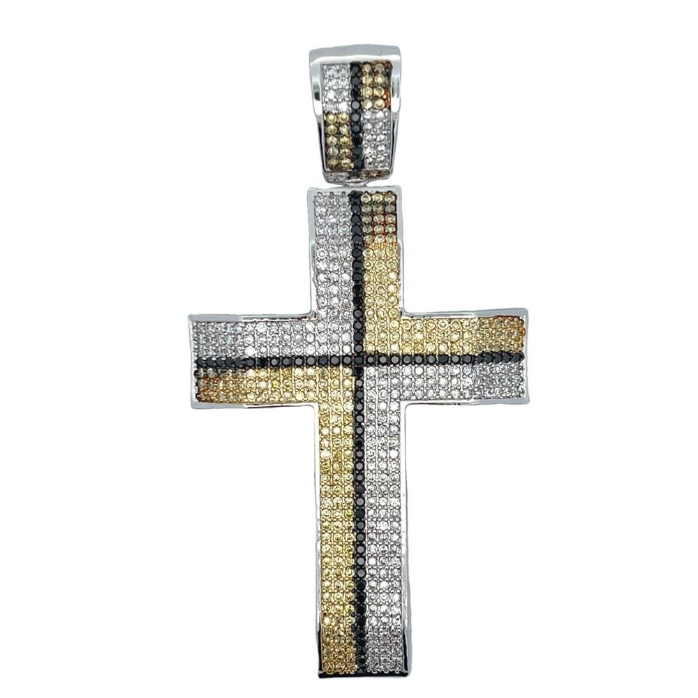 7 Row Blocked White Black & Yellow CZ Cross Iced Out Pendant Rhodium. This hip hop pendant features round cut simulated diamond stones giving this bling bling charm a unique shine and look to it. Beautifully crafted with precision stone setting. Hot style iced out Pendant that is unique and stands out from the crowd. The VVS CZ Simulated Diamonds have a bling bling shine as if they were genuine diamonds.