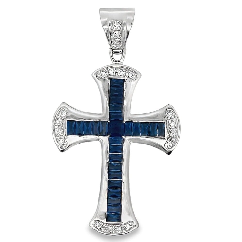 Designer Cross Blue CZ Pendant .925 Sterling Silver. Quality crafted hip hop bling pendant. Crafted from fine .925 Sterling Silver and wrapped to look and feel like solid Gold at a fraction of the cost. Prong set CZ Cubic Zirconia stones, set with precision gives this iced out pendant a beautiful and bright bling bling shine. A must have in your hip hop jewelry collection.