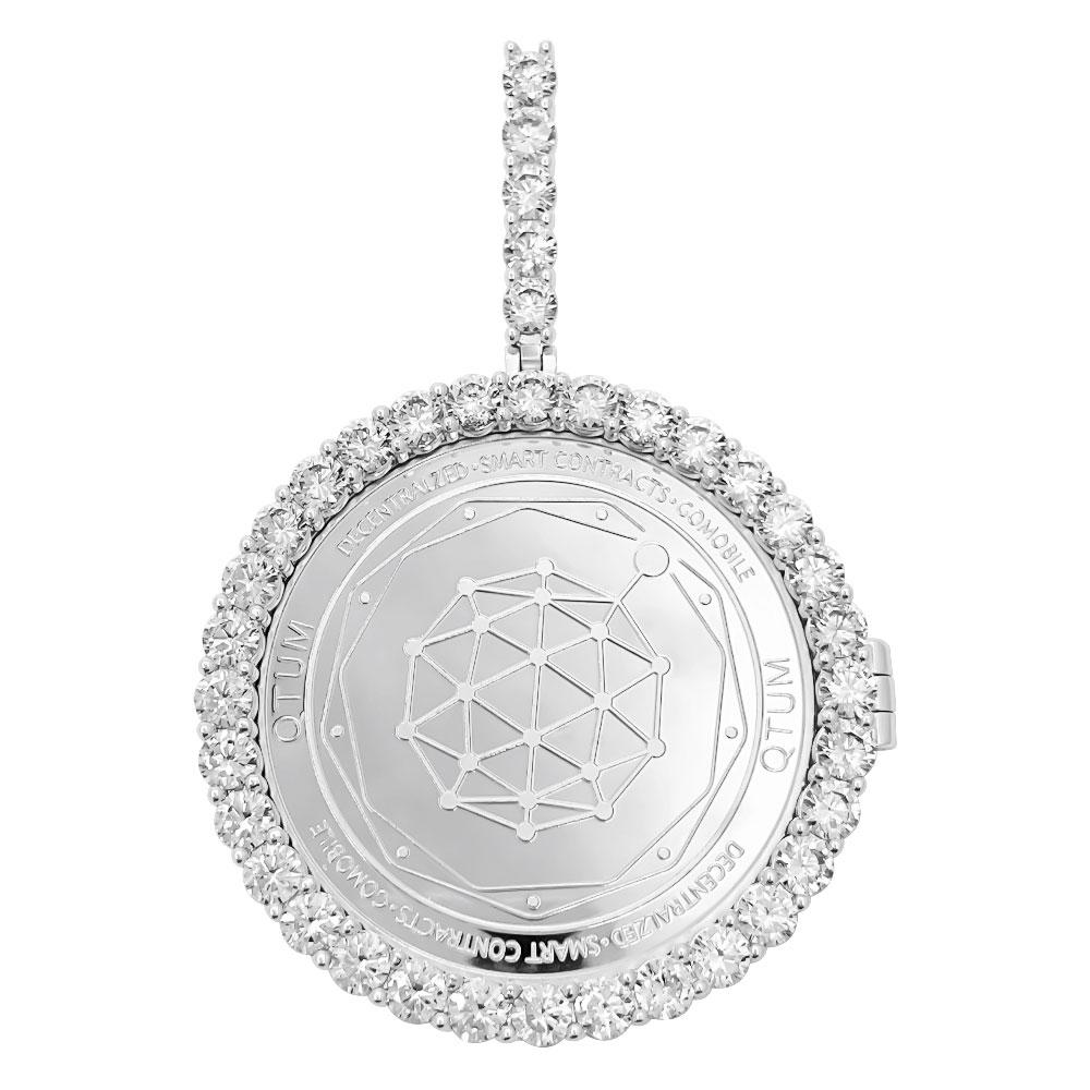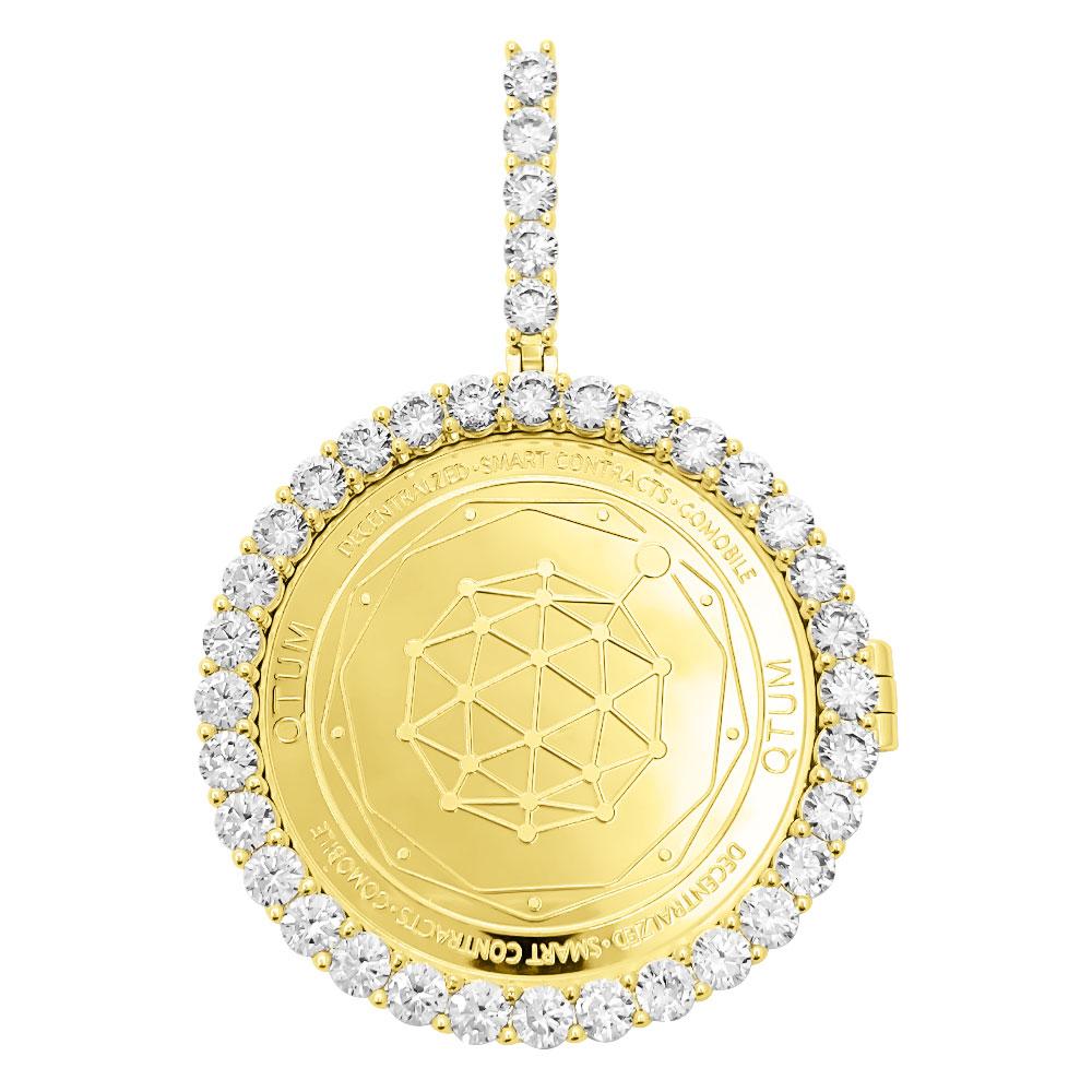 QTUM Coin Iced Out Frame Pendant. Cryptocurrency has become popular in recent years and here is your opportunity to represent in style! The coin measures 40MM in diameter and is embedded in the frame of your choice. It can be iced up in 2 different says with CZ VVS Simulated Diamonds or in a low key plain frame. This commemorative Crypto Currency coin is sure to turn heads and make a great conversation starter. Available in Yellow Gold or White Gold Plating options. The VVS CZ Simulated Diamonds have a bling bling shine as if they were genuine diamonds.