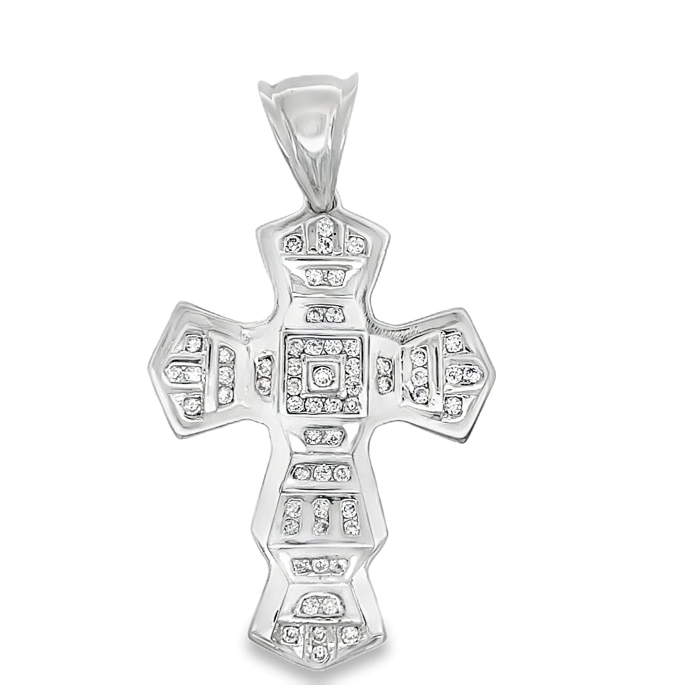 Thick Sharp Cross CZ Pendant .925 Sterling Silver. Quality crafted hip hop bling pendant. Crafted from fine .925 Sterling Silver and wrapped to look and feel like solid Gold at a fraction of the cost. Prong set CZ Cubic Zirconia stones, set with precision gives this iced out pendant a beautiful and bright bling bling shine. A must have in your hip hop jewelry collection.