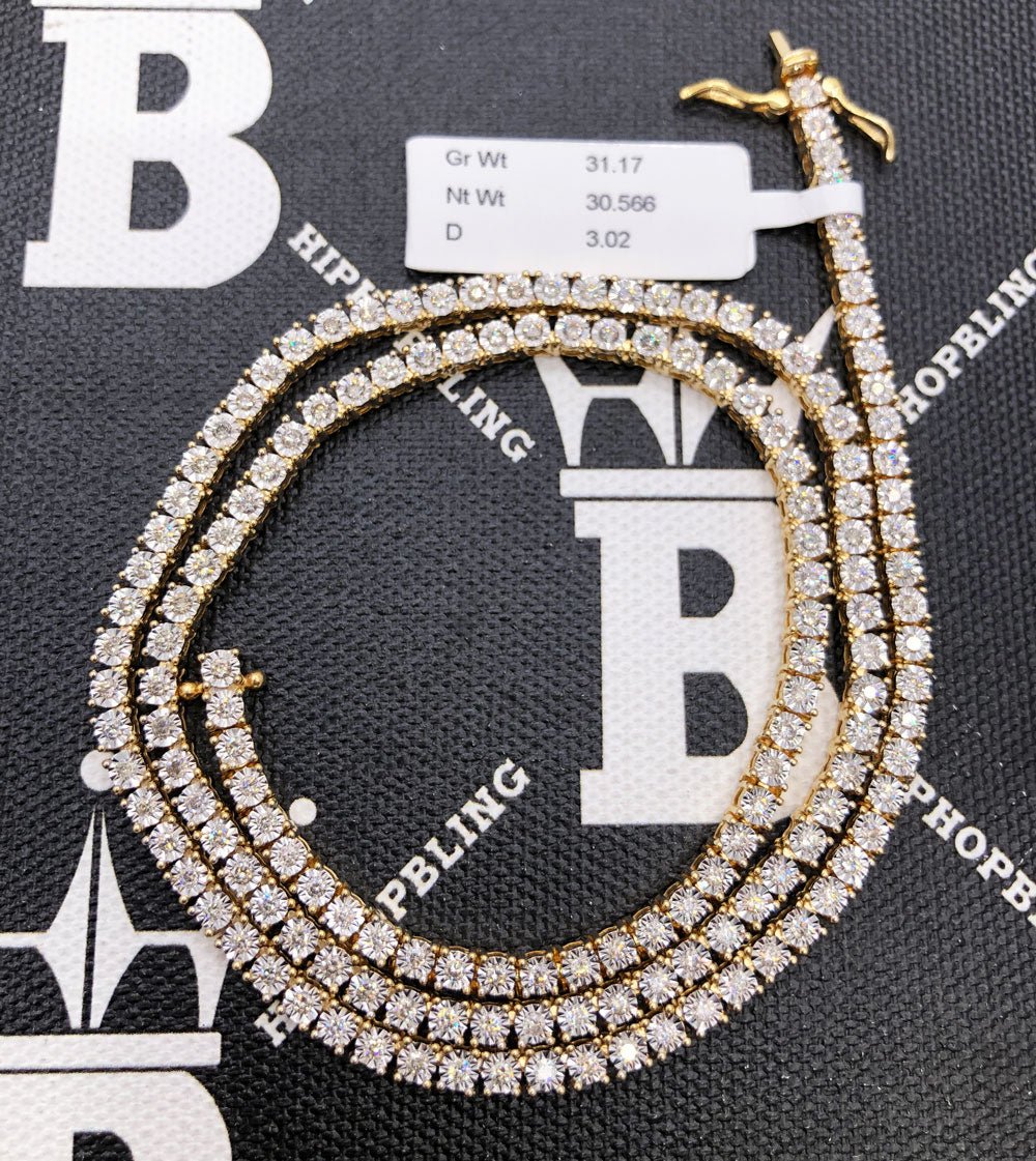 10K Yellow Gold Diamond Tennis Chain 3MM Miracle Setting. Micro Pave Prong Set round cut diamonds. Miracle setting to look like a 15 Carat Diamond Chain that would cost over $10,000. Ice your neck with this incredible iced out diamond tennis chain. Diamonds are real and hand set with prongs. Order your iced out diamond tennis chain today.