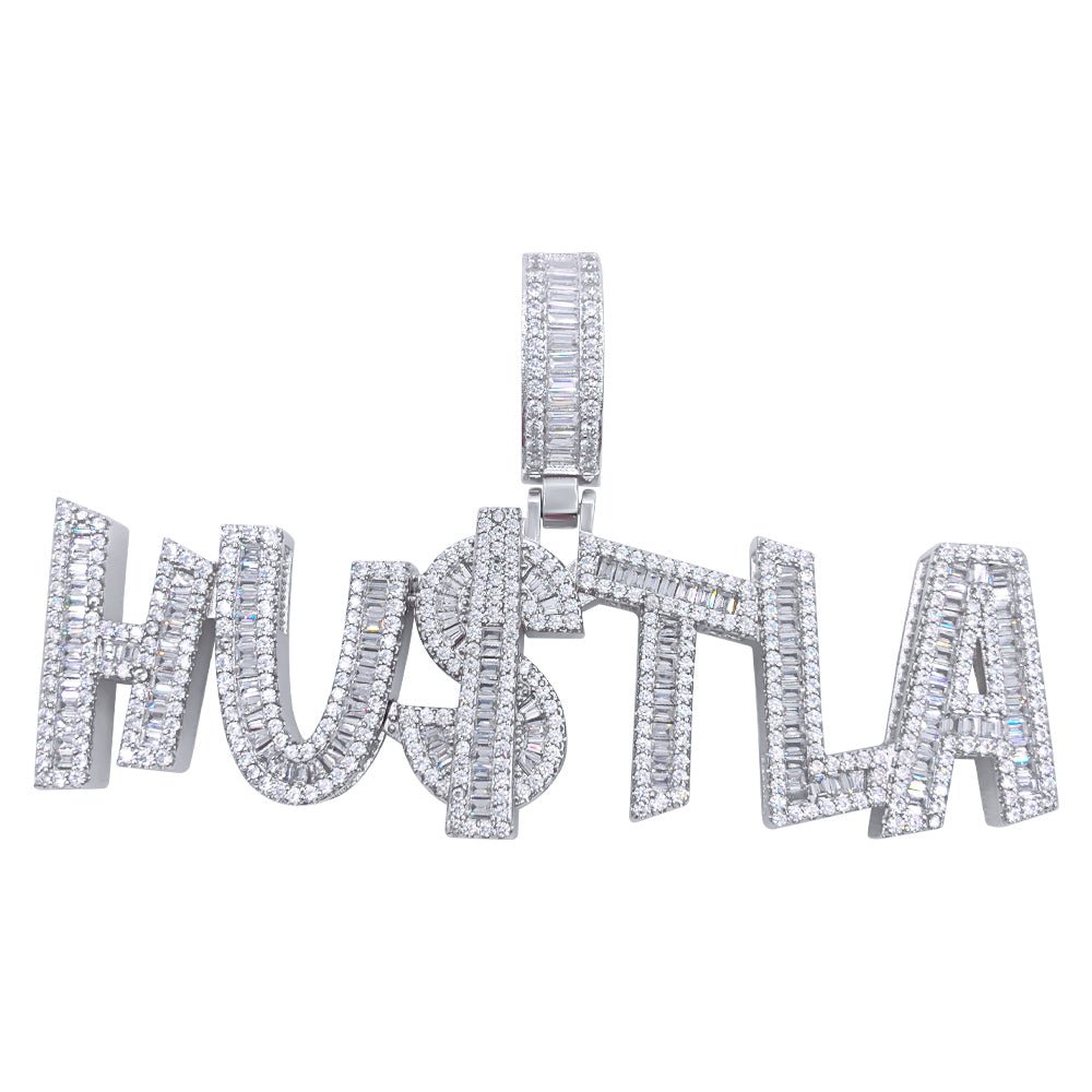 .925 Sterling Silver HU$TLA HUSTLA Baguette VVS CZ Iced Out Pendant. Crafted from real Solid .925 Sterling Silver with an incredible bling bling shine. Limited Edition Iced Out Hip Hop Pendant. Stones are VVS Simulated Diamonds Prong Set, the same way genuine diamond hip hop jewelry is made. Get the same look, feel and shine for less on real Silver. Stand out from the crowd with this this detailed quality made iced out pendant.