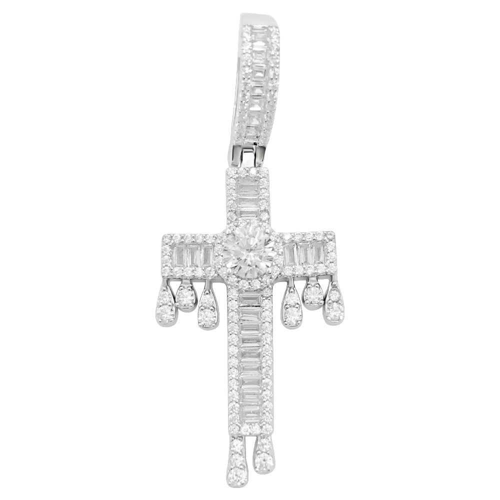 .925 Sterling Silver Drip Cross Baguette CZ Iced Out Pendant. Crafted from Solid .925 Sterling Silver with an incredible bling bling shine. Limited Edition Iced Out Hip Hop Pendant. Stones are VVS Simulated Diamonds Prong Set, the same way genuine diamond hip hop jewelry is made. Stand out from the crowd with this this detailed quality made iced out pendant.