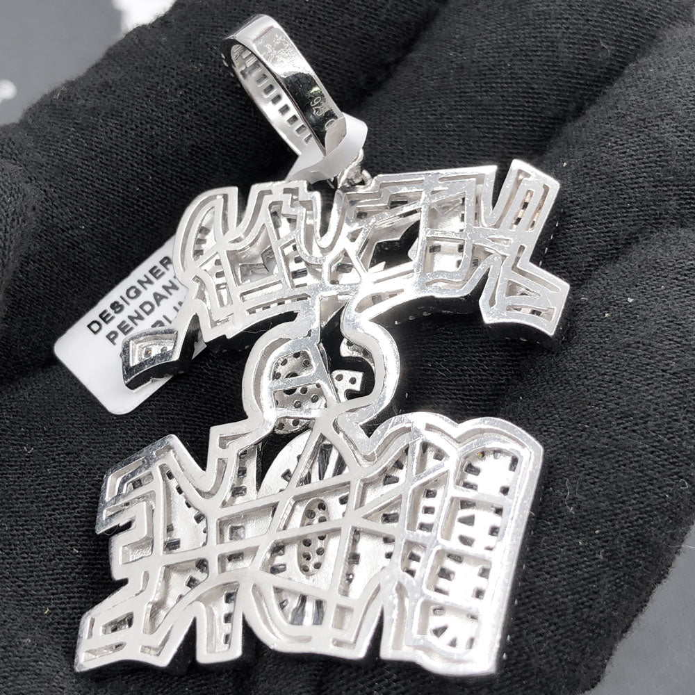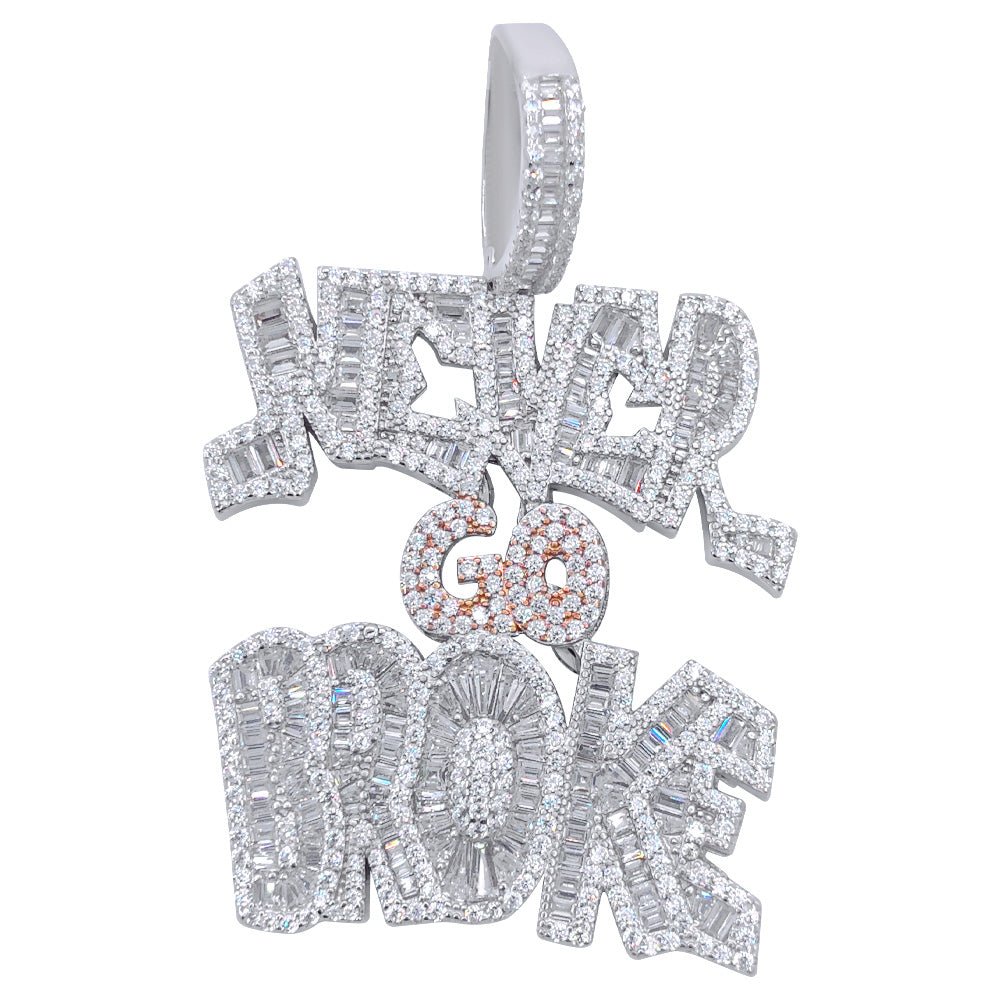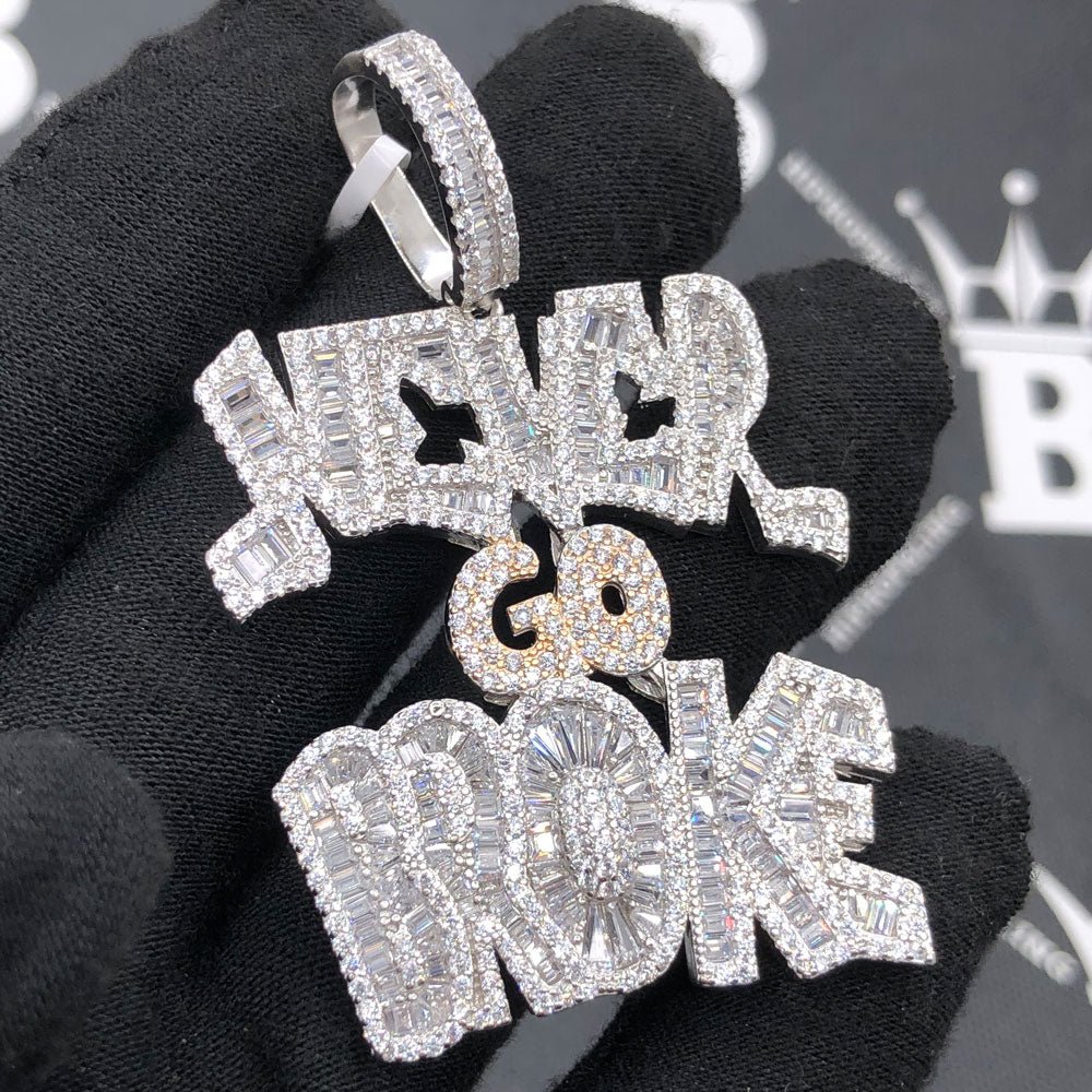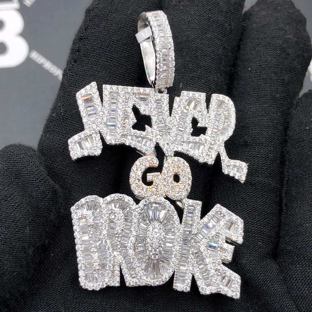 .925 Sterling Silver Never Go Broke Baguette VVS CZ Iced Out Pendant. Crafted from real Solid .925 Sterling Silver with an incredible bling bling shine. Limited Edition Iced Out Hip Hop Pendant. Stones are VVS Simulated Diamonds Prong Set, the same way genuine diamond hip hop jewelry is made. Get the same look, feel and shine for less on real Silver. Stand out from the crowd with this this detailed quality made iced out pendant.
