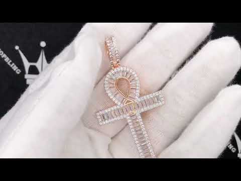 .925 Silver Rose Ankh Baguette CZ Iced Out Pendant.  Crafted from real Solid .925 Sterling Silver with an incredible bling bling shine.  Limited Edition Iced Out Hip Hop Pendant.  Stones are VVS Simulated Diamonds Prong Set, the same way genuine diamond hip hop jewelry is made.  Get the same look, feel and shine for less on real Silver.  Stand out from the crowd with this this detailed quality made iced out pendant.