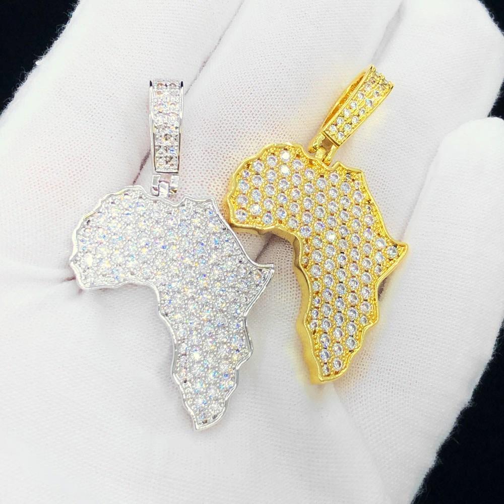 Africa Continent Hip Hop Bling Bling Pendant. Unique Detailed Iced Out Africa Pendant with Rich Details and a solid back. Incredible bling bling shining hip hop jewelry. Beautifully crafted with precision stone setting. Quality Crafted Hip Hop bling bling Pendant that is available in Yellow Gold or White Gold Plating options. The VVS CZ Simulated Diamonds have a bling bling shine as if they were genuine diamonds.
