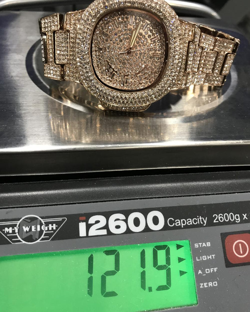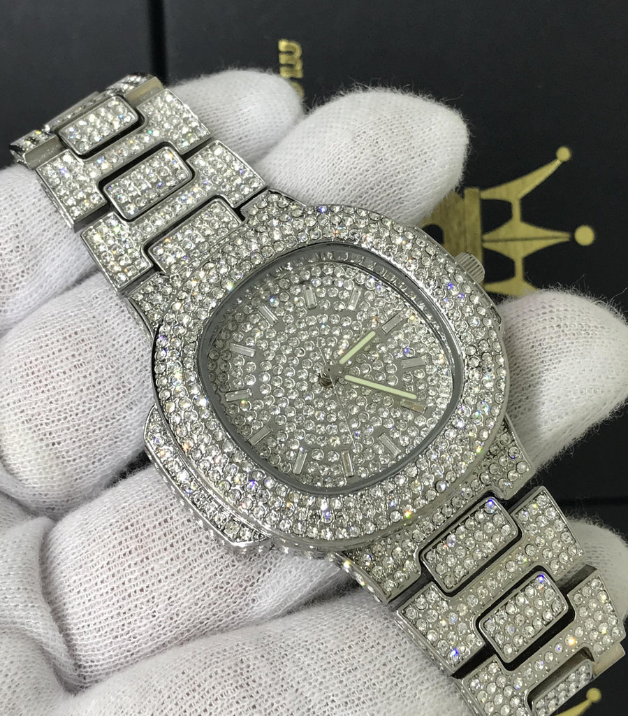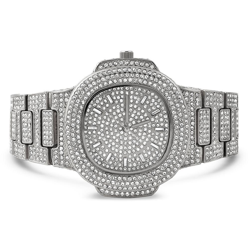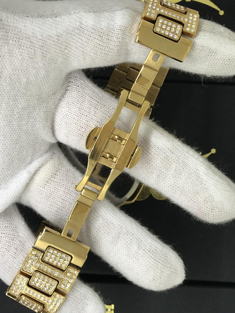 NEW Big Face 44MM Bling Bling Fully Custom Ice Blizzard Watch. Incredible bling bling shine on this gold hip hop watch. Iced out with well over 1500 Simulated diamond Czech Crystal Stones covering the dial, bezel, side of bezel, lugs, case, band, and even the side of the band!. Features a Stainless Steel Butterfly Clasp for that high end look and feel. This bling bling watch is made on a much higher quality level than the rest of the watches out there. Better, long lasting Gold color, brighter shine, and full stone coverage all the way around the band. Order your Big Face Blizzard Bling Bling Watch Today.
