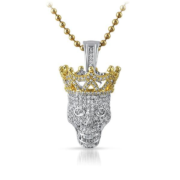 Bling bling 3D skull pendant iced out to the max. This quality skull pendant is intricately detailed with incredible shine. The skull part is rhodium dipped with the full 3D crown being 14K gold dipped with all hand set simulated diamonds. Nice detailed micro skull pendant with hundreds of hand set stones. Order yours today at this amazing price.