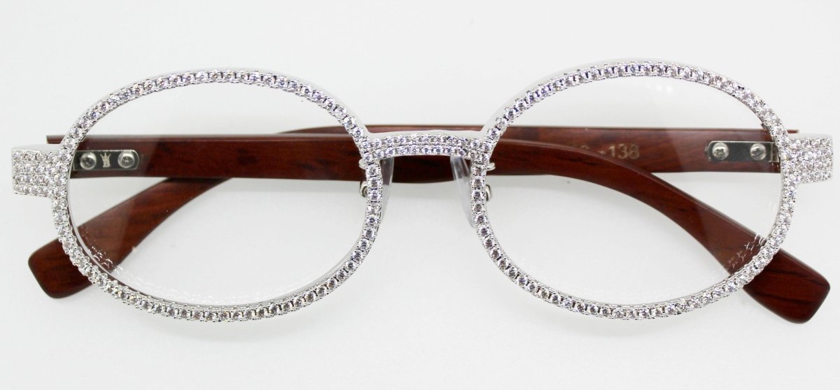 Custom Glasses Frames totally iced out. You got the grillz, you got the chain, the watch, now ice up your eyes with this custom made glasses frame. White or Yellow Gold bonded with wooden temples.